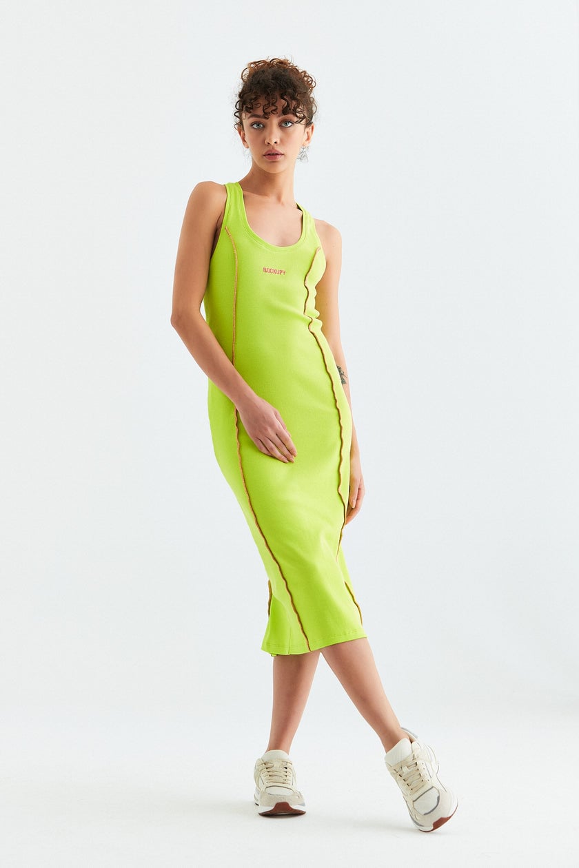 Üzerinde pembe veya yeşil overlok dikişli ve overlok dikişleri renginde, göğsün ortasında orijinal logo nakışlı, ribana uzun kadın elbise. Yeşil ve mavi renk opsiyonlarıyla halter yaka elbise, vücudu hoş bir şekilde sarar.