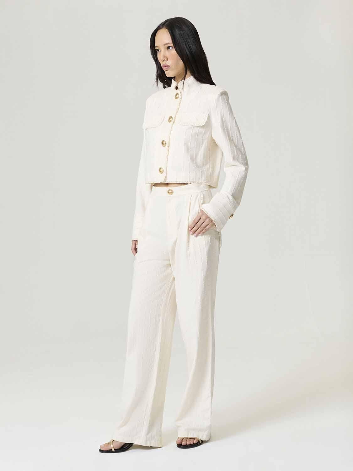 Klasik kesimi modern detaylarla buluşturan bu şerit fırfırlı pantolon, feminen ve zarif bir duruş sunuyor. Regular fit ve tam kalıbı sayesinde vücuda dengeli bir oturuş sağlarken, boru paça formu silueti uzun ve şık gösteriyor. Normal bel yapısı ve fermuar ile çıtçıt kapaması, temiz bir bitiş sunarken, cep kenarlarındaki şerit fırfır süslemeleri tasarıma zarif bir hareket ve sofistike bir dokunuş katıyor. Astarsız dokuma kumaşı, gün boyu konfor ve hafiflik sağlarken, hem ofis hem de şehirli günlük kombinlerde öne çıkan bir stil yaratıyor. Kalıp: Regular Fit Beden Önerisi: Kendi bedeninizi tercih etmenizi tavsiye ederiz. Model Ürün Bedeni: S Model Bedeni: Boy 1.76 / Göğüs 78 cm / Bel 59 cm / Kalça 88 cm
