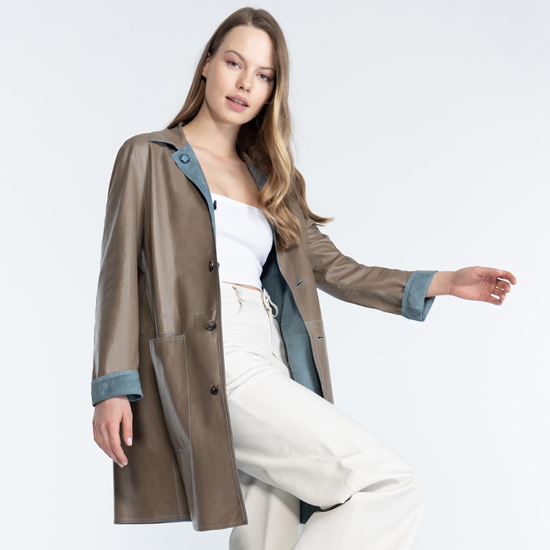 Günlük kullanım için çok uygun ve rahat bir kalıptır. Ön yüzü süet deri, diğer yüzü ise deri olarak tasarlanmış ve astarsız çalışılmıştır. %100 keçi derisidir, çift taraflı çalışılmıştır. Süet yüzünde İki adet yandan fermuarlı cebi ve deri yüzünde torba cebi bulunmaktadır. Önden düğme kapamalıdır.. Bu ürün, et endüstrisinin yan ürünü olarak elde edilen ve sürdürülebilir yöntemler ile Leather Working Group Altın sertifikalı Desa tesislerinde tabaklanan deriler kullanılarak üretilmiştir.-Günlük kullanım için çok uygun ve rahat bir kalıptır. Ön yüzü süet deri, diğer yüzü ise deri olarak tasarlanmış ve astarsız çalışılmıştır. %100 keçi derisidir, çift taraflı çalışılmıştır. Süet yüzünde İki adet yandan fermuarlı cebi ve deri yüzünde torba cebi bulunmaktadır. Önden düğme kapamalıdır.. Bu ürün, et endüstrisinin yan ürünü olarak elde edilen ve sürdürülebilir yöntemler ile Leather Working Group Altın sertifikalı Desa tesislerinde tabaklanan deriler kullanılarak üretilmiştir.