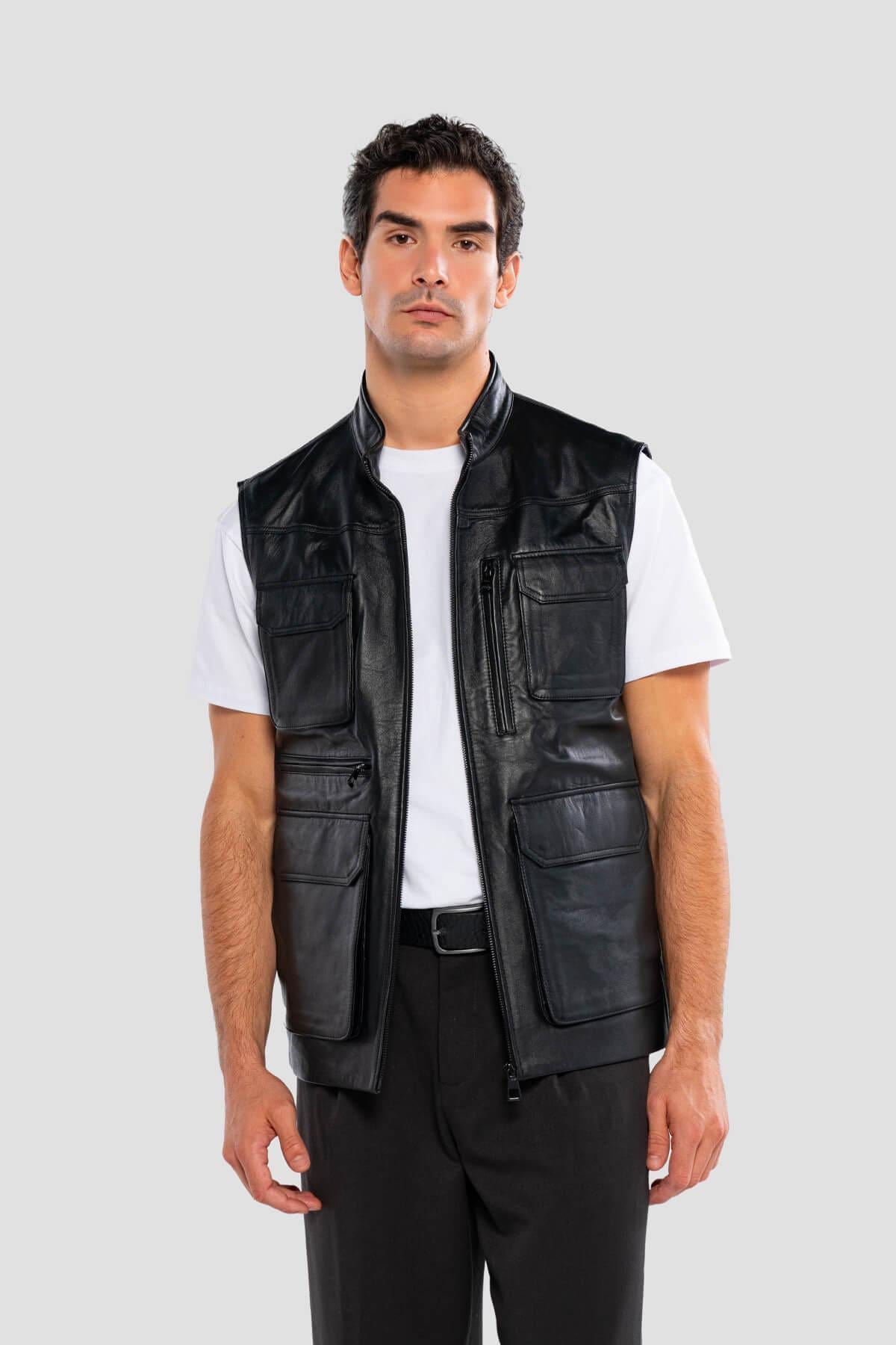 Tamer Tanca Erkek Hakiki Deri Siyah Yelek Deri Mont