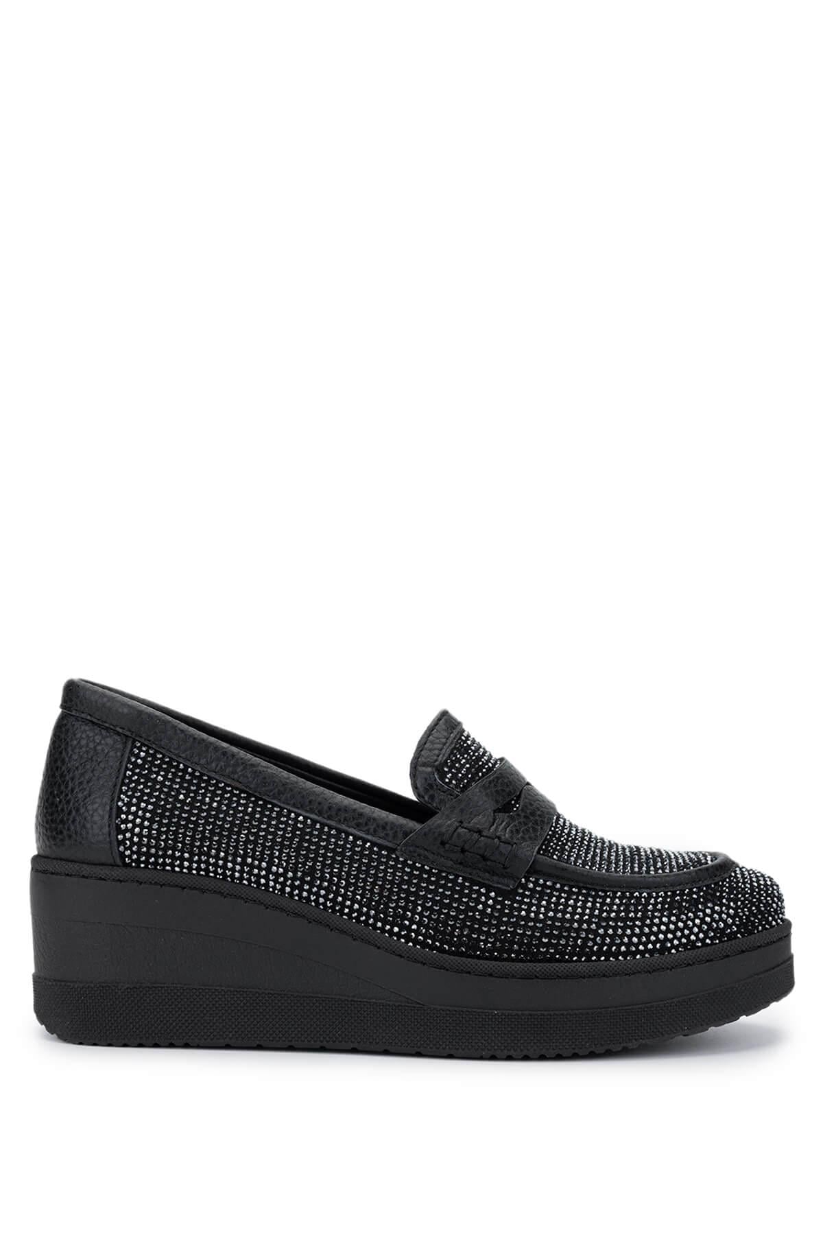 Tamer Tanca Kadın Hakiki Deri Siyah Taşlı Loafer Ayakkabı