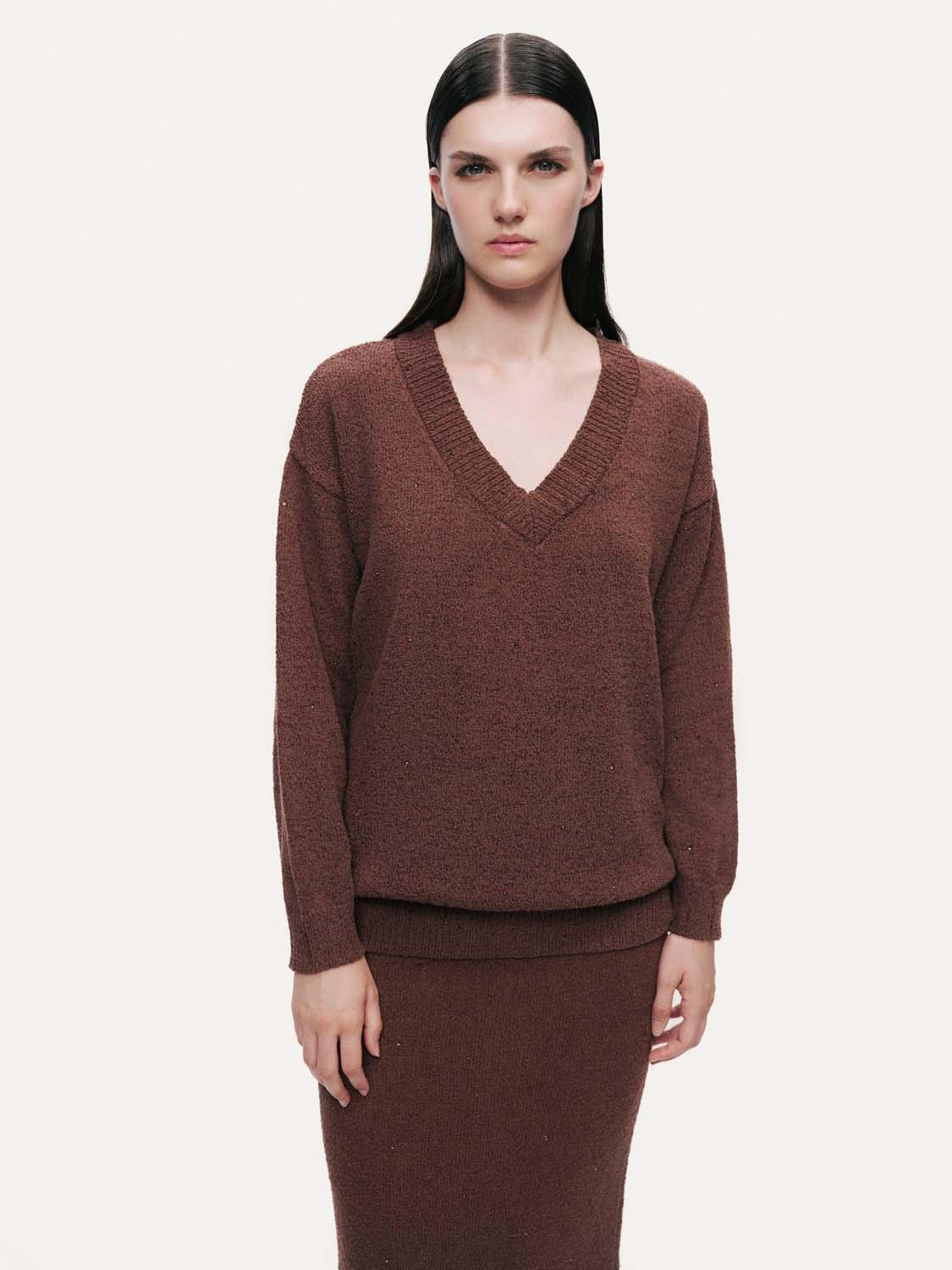 Bu işlemeli V yakalı kazakla triko koleksiyonunuza zarif bir ışıltı katın. Yumuşak, astarsız örme kumaştan üretilen bu kazak, uzun kollu klasik bir silüete ve hoş bir V yakaya sahip. Öne çıkan özelliği mi? Her hareketinizde ışığı yakalayan özenle yerleştirilmiş kristal süslemeler. Hem günlük şıklık hem de şık akşamlar için ideal olan bu kazak, serin günlere zarif bir ihtişam katıyor. Kalıp: Relaxed Fit Beden Önerisi: Bu model, bol ve rahat bir kesime sahiptir. İstediğiniz görünüm için gerçek bedeninizi veya biraz daha dar bir kesim için bir beden küçüğünü seçin. Model Ürün Bedeni: S Model Bedeni: Boy 1.79 / Göğüs 83 cm / Bel 64 cm / Kalça 90 cm