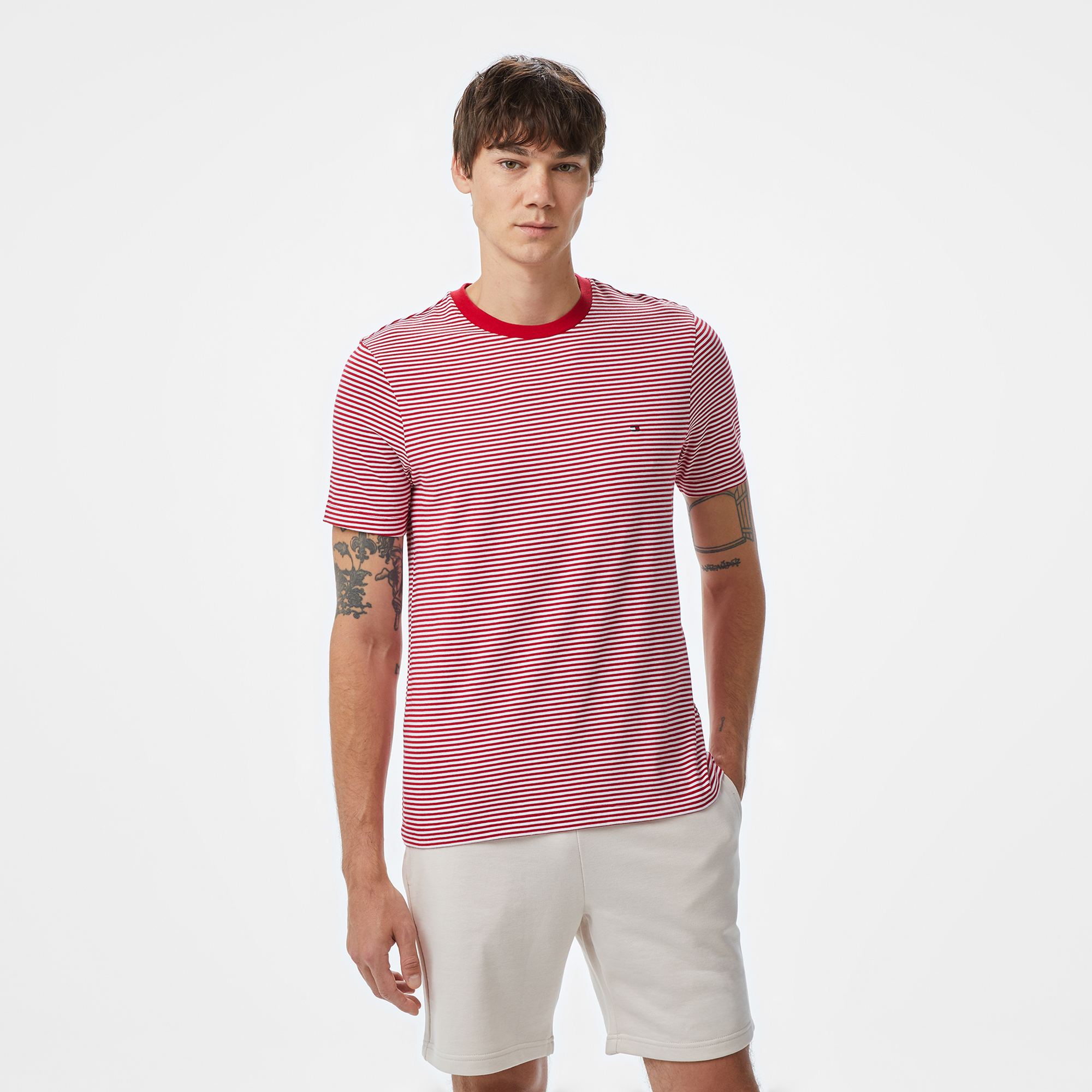TOMMY HILFIGER erkek tişörtü ile şıklığı ve rahatlığı bir arada yaşa! Bu kırmızı-beyaz ince çizgili tasarım, gündelik stiline dinamik bir dokunuş katmak için ideal. Yumuşak dokusu ve kaliteli kumaşı sayesinde hem konforu hissedecek hem de tarzını ön plana çıkaracaksın.