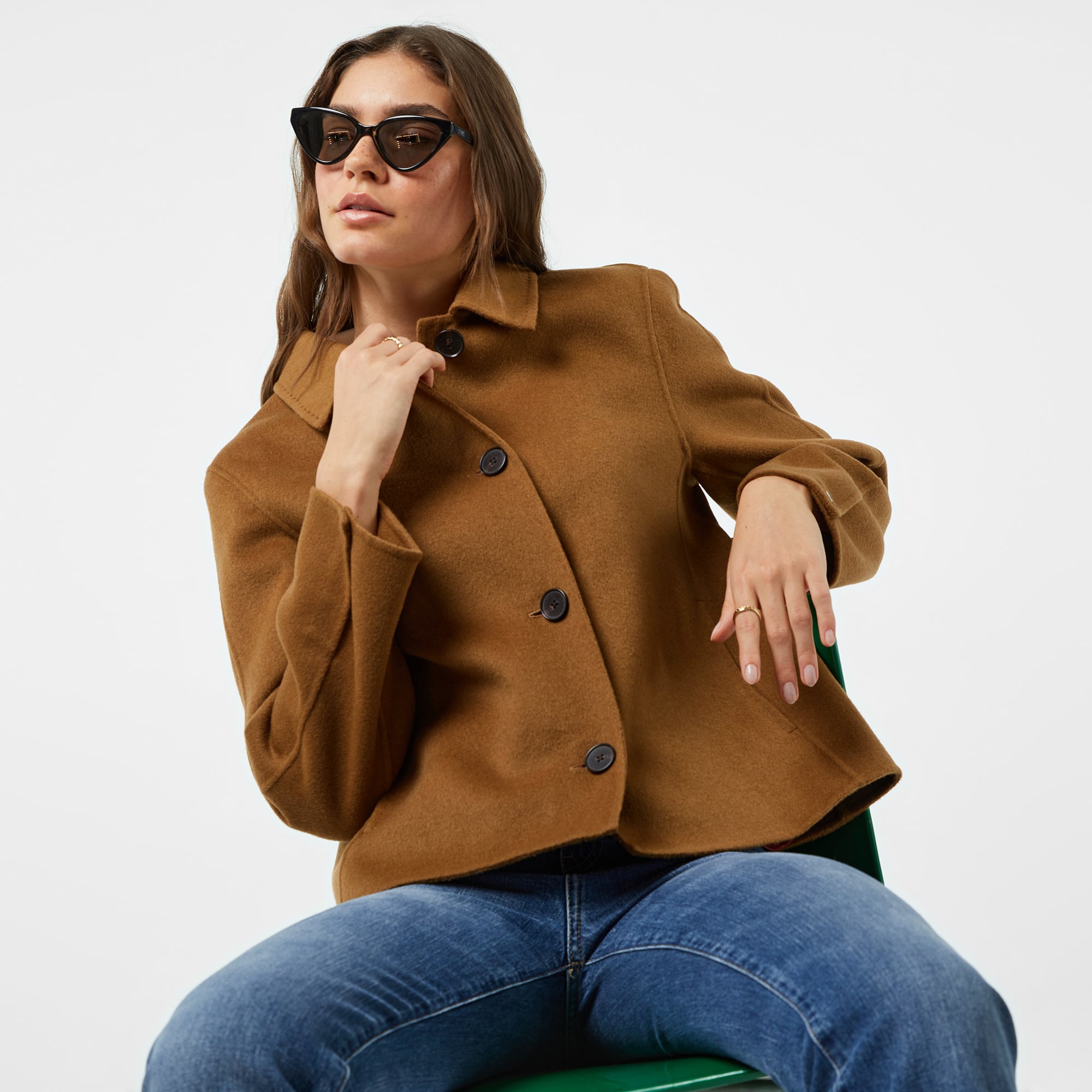 Kısa, tek düğmeli bir silüete sahip olan bu yün açısından zengin, çift taraflı trençkot, geçiş gardırobunuza kusursuz bir şekilde uyum sağlayacak.