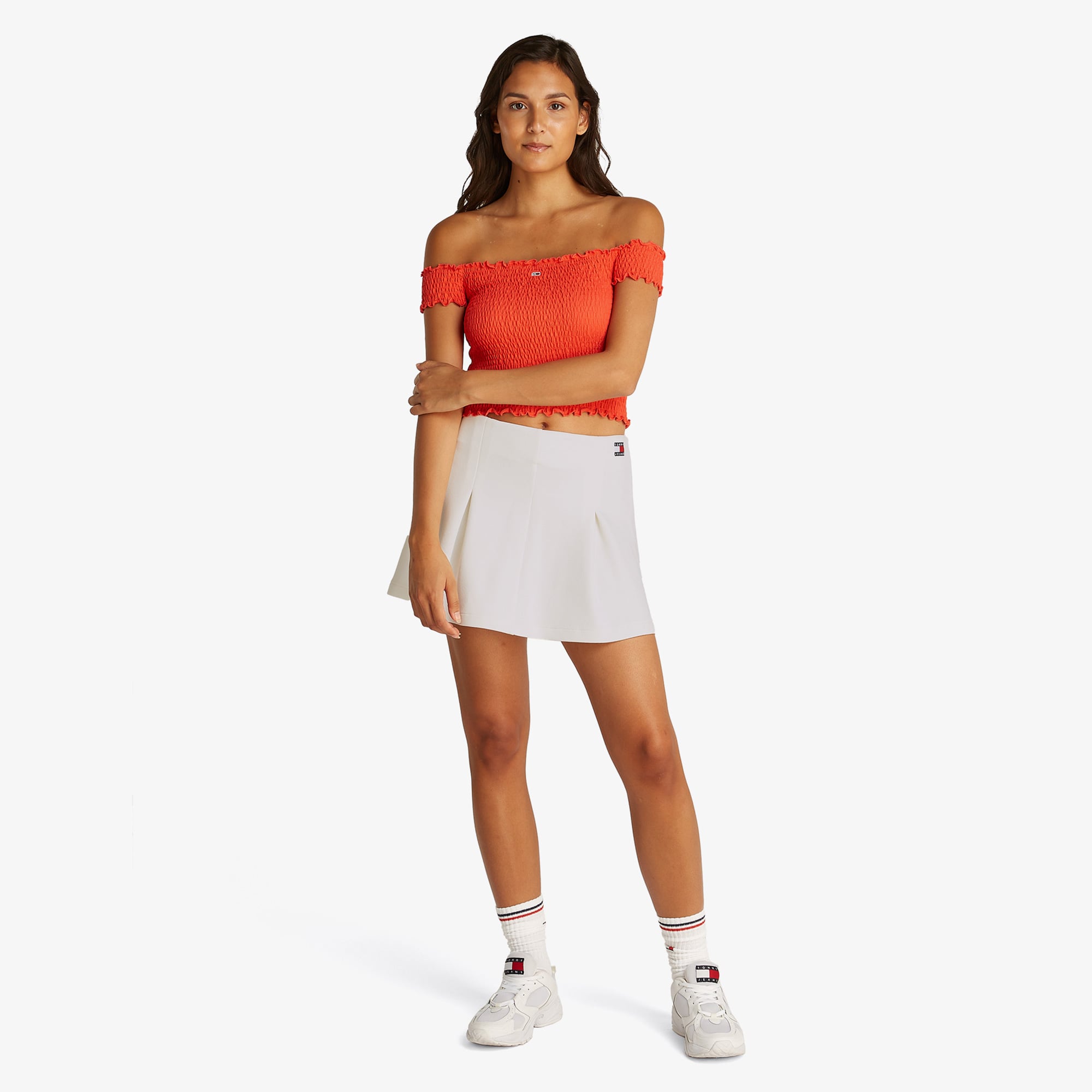 Tommy Hilfiger logolu aksesuar detayları, eteğin şıklığını pekiştirir.