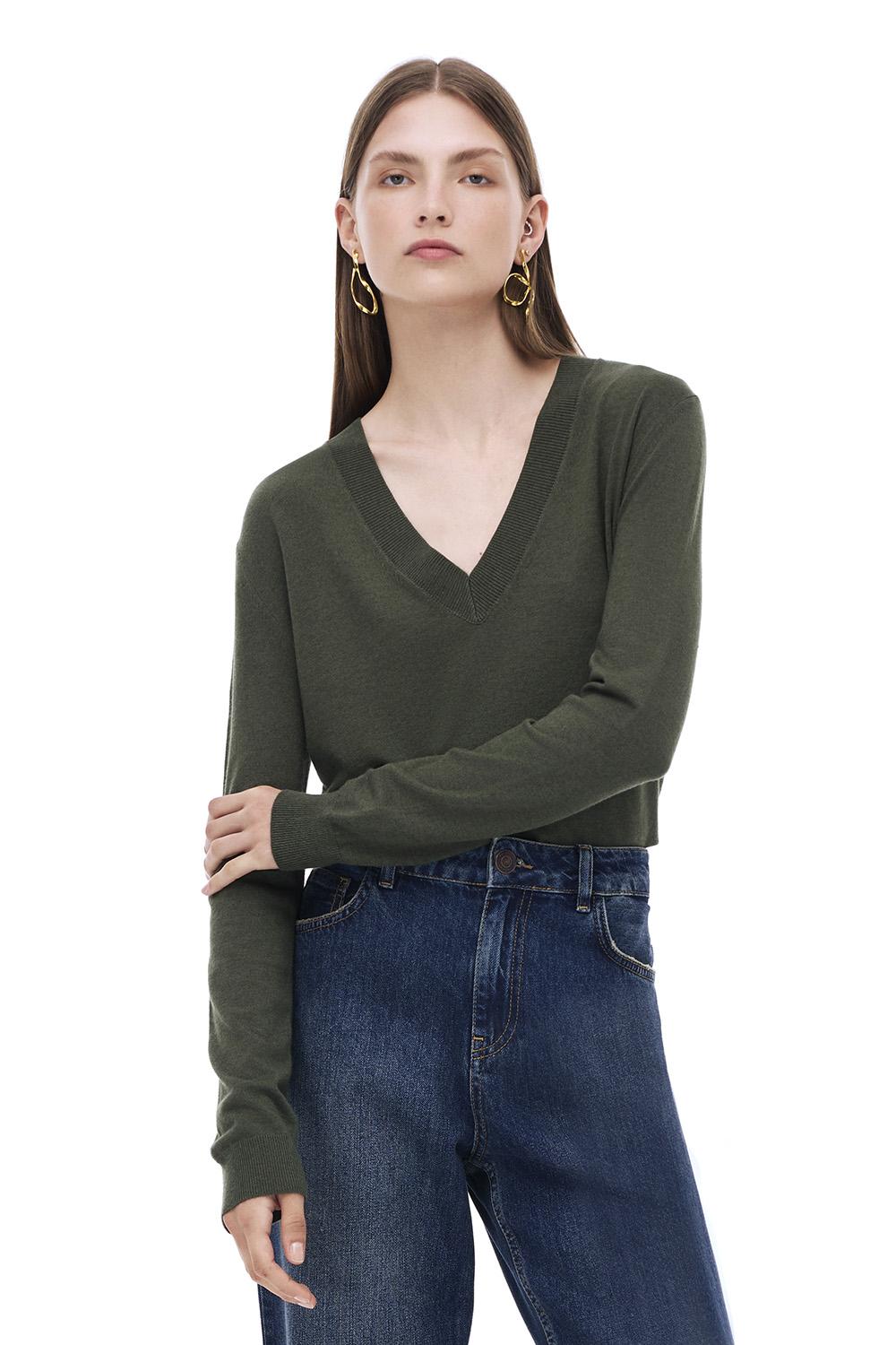 Triko Rahat Kalıp Standart Boy Takma Kol V-Yaka Hakı Kazak