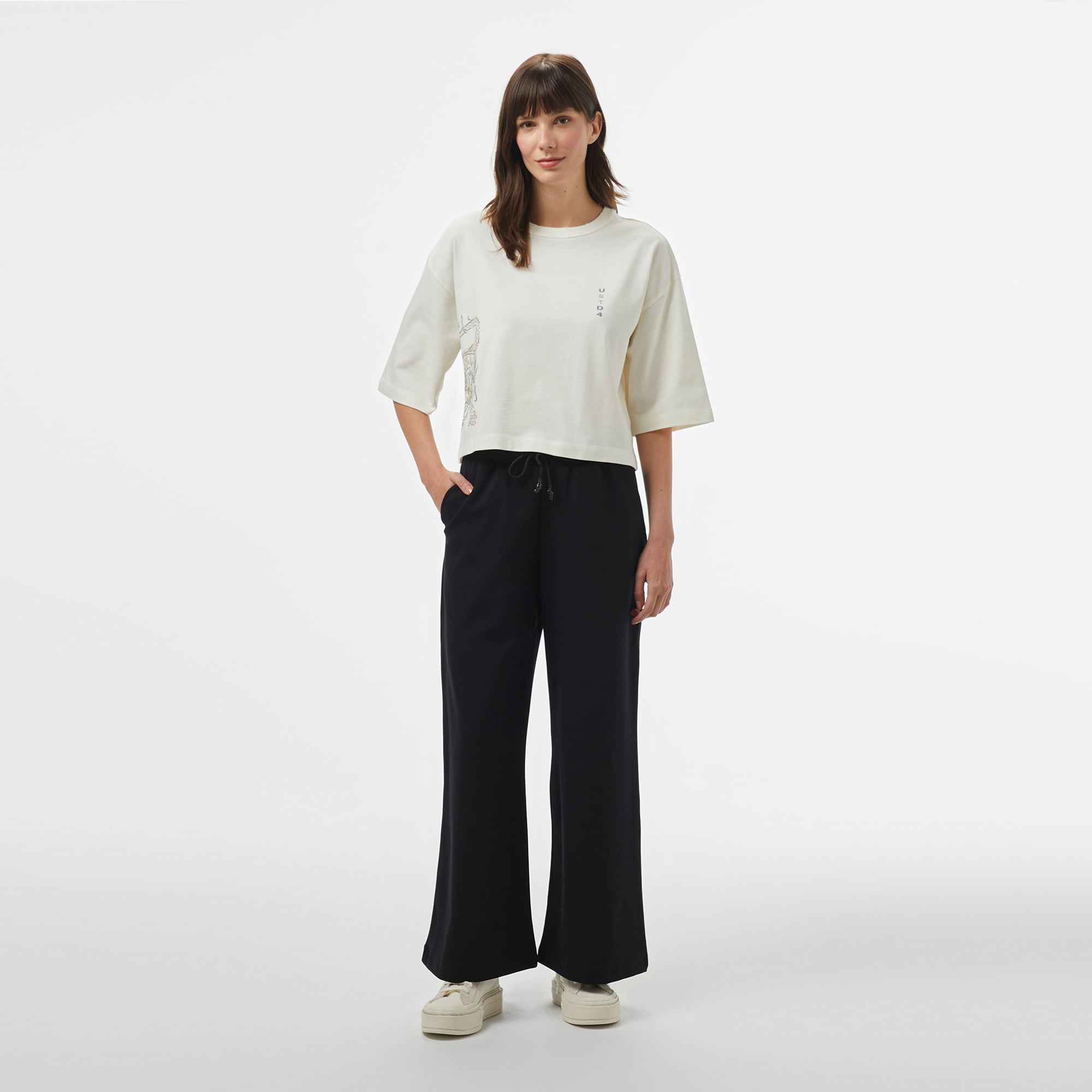United4 kadın siyah eşofman altı, rahat bir günlük kullanım için ideal bir üründür. %80 pamuk, %15 polyester ve %5 elastan karışımı kumaşı, yumuşak ve esnek bir yapı sunarak hareket özgürlüğü sağlar. Elastik bel bandı ve dış kordon, kişisel uyum sağlar. Sade tasarımı, her türlü kombinle kolayca uyum gösterir ve şıklığınızı tamamlar.