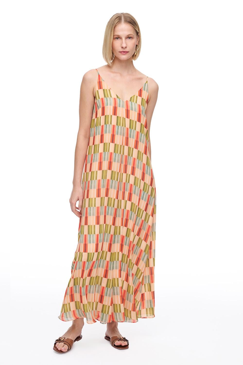 Kalıp : Rahat Kalıp Kol : Askılı Yaka : V-Yaka Göğüs : 88 Arka Orta Boy : 118.2 Model Boyu : Uzun Boy Dokuma-Örme : DOKUMA Cinsiyet : Kadın Üretim Yeri : Türkiye Desen : Geometrik Karışım : %100 Poliester Sezon : 2025 İLKBAHAR YAZ