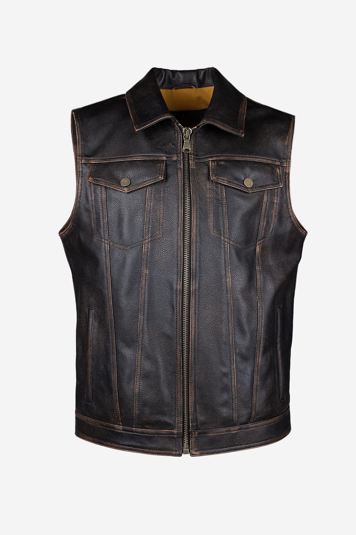 Valmenti Erkek Hakiki Deri Kızıl Eskitme Yelek Deri Mont