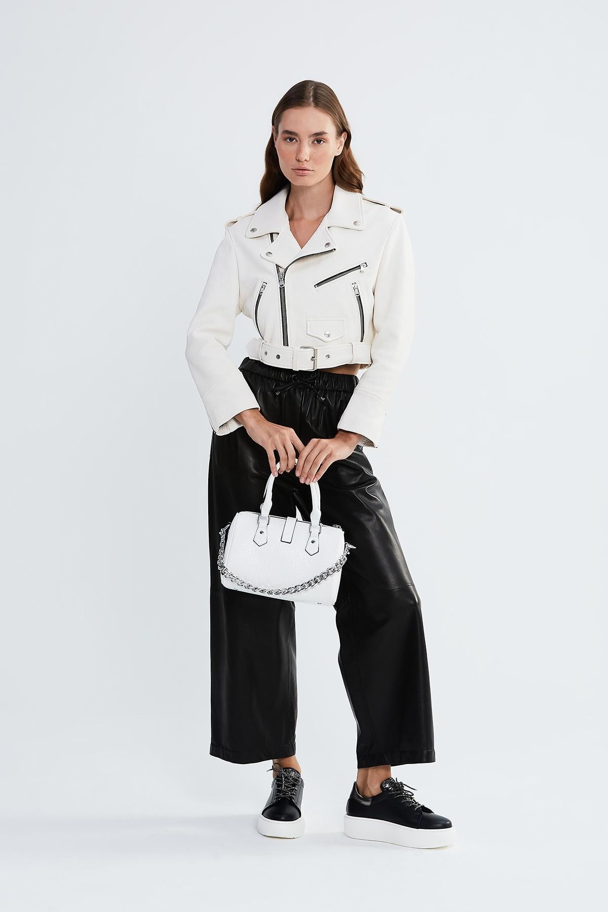 Dış Materyal Adı: Hakiki Deri İç Materyal Adı: Saten Astar Ürün Hammadde: Kuzu Derisi Kullanılmıştır. Üretim Yeri: Türkiye