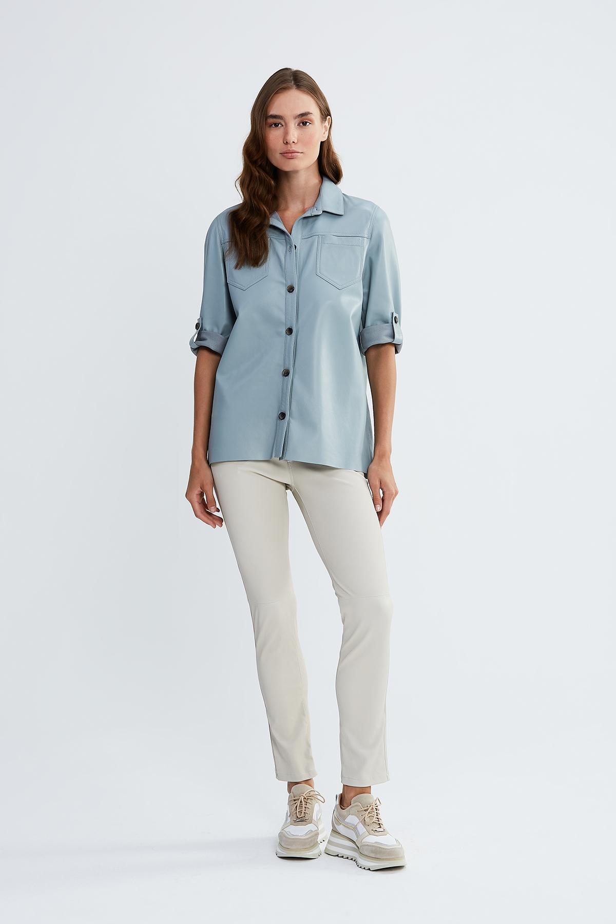 Valmenti Kadın Gümüş Metalik Hakiki Deri Deri Gömlek