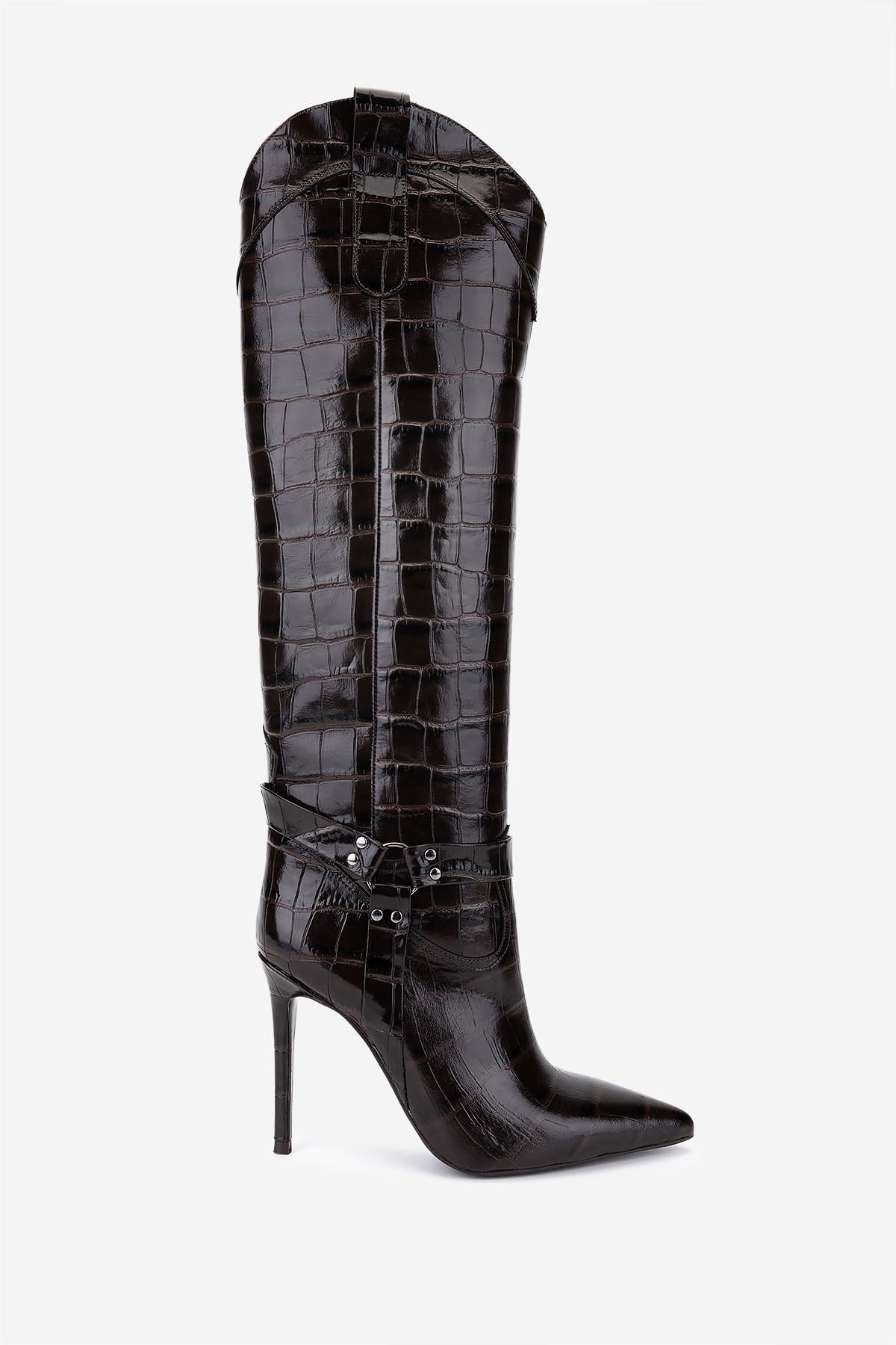Valmenti Kadın Hakiki Deri Kahverengi Kroko Topuklu Çizme