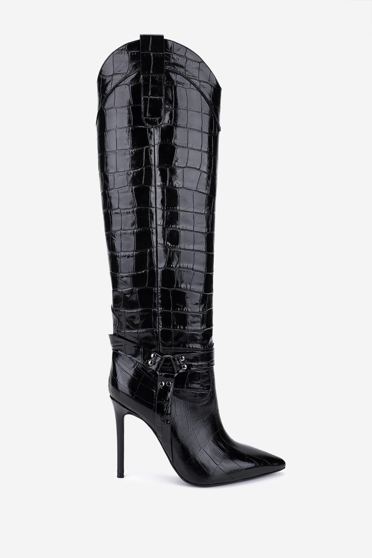 Valmenti Kadın Hakiki Deri Siyah Kroko Topuklu Çizme