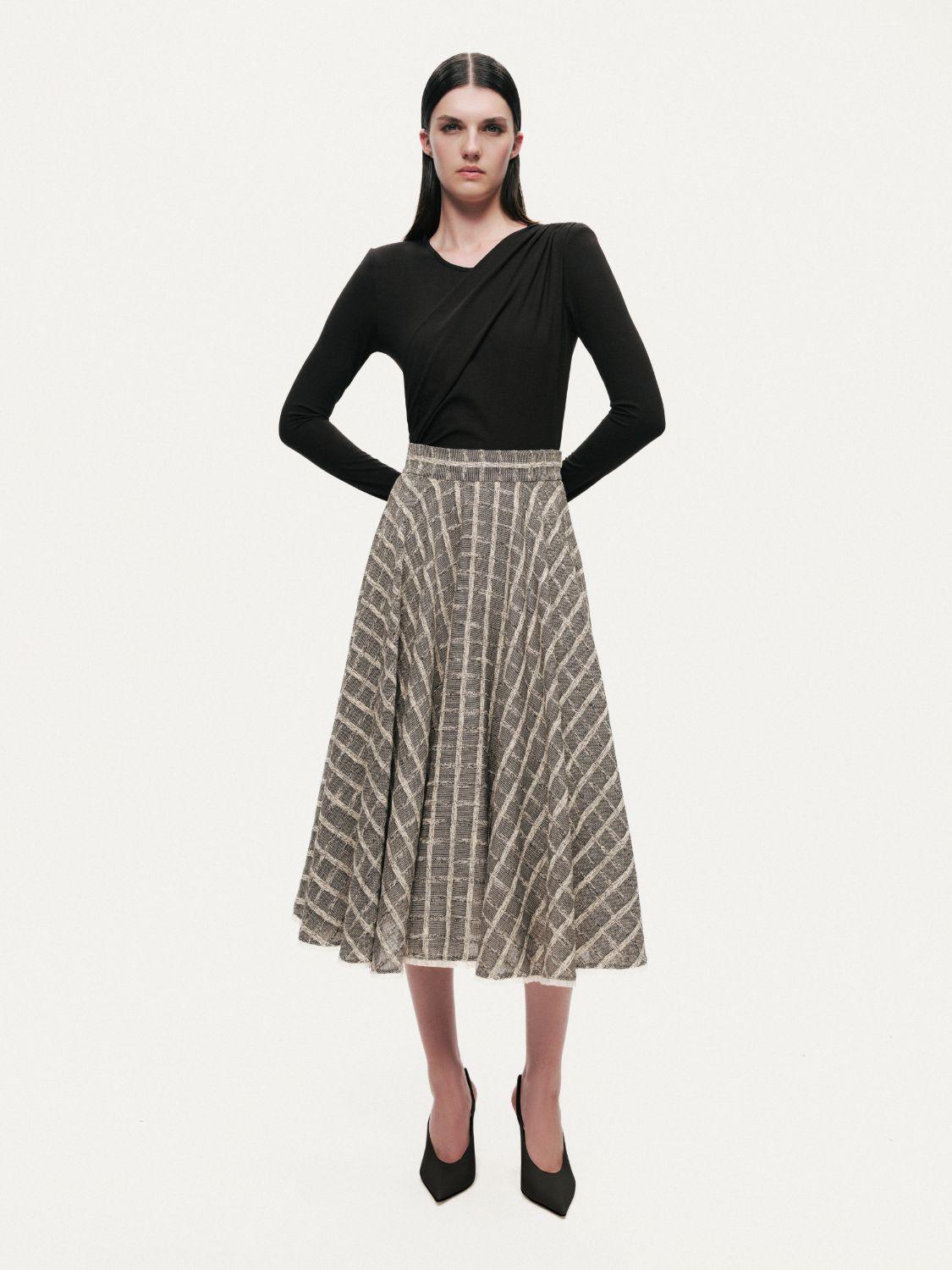 Bu fırfırlı midi etekle sonbahar gardırobunuza hareket ve şıklık katın. Tamamen astarlı dokuma kumaştan üretilen etek, normal beldir ve dikişsiz bir silüet için gizli bir arka fermuara sahiptir. Midi boy etek ucu, yürürken yumuşak bir hacim ve akıcı bir hareket sağlayan katmanlı fırfırlarla zenginleştirilmiştir. Hem gündüz gezileri hem de akşam etkinlikleri için mükemmeldir; içine sokulmuş bir örgü veya dar bir üst ile kombinleyebilirsiniz. Kalıp: Regular Fit Model Ürün Bedeni: S Model Bedeni: Boy 1.79 / Göğüs 833 cm / Bel 64 cm / Kalça 90 cm