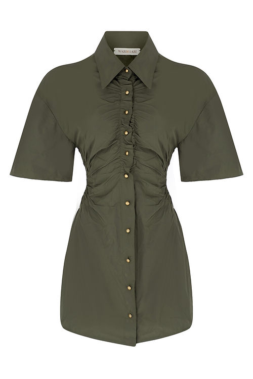 Gömlek elbise, modern unsurlarıyla yeniden çerçevelenmiş zamansız bir parçadır. Bu stil, çizgili bel dekolte detayıyla zenginleştirilmiş bir kesimi ortaya çıkarır. Gömlek elbise, modern bir görünüm için WABISABI gardırobundaki her şeyle eşleştirilebilir.