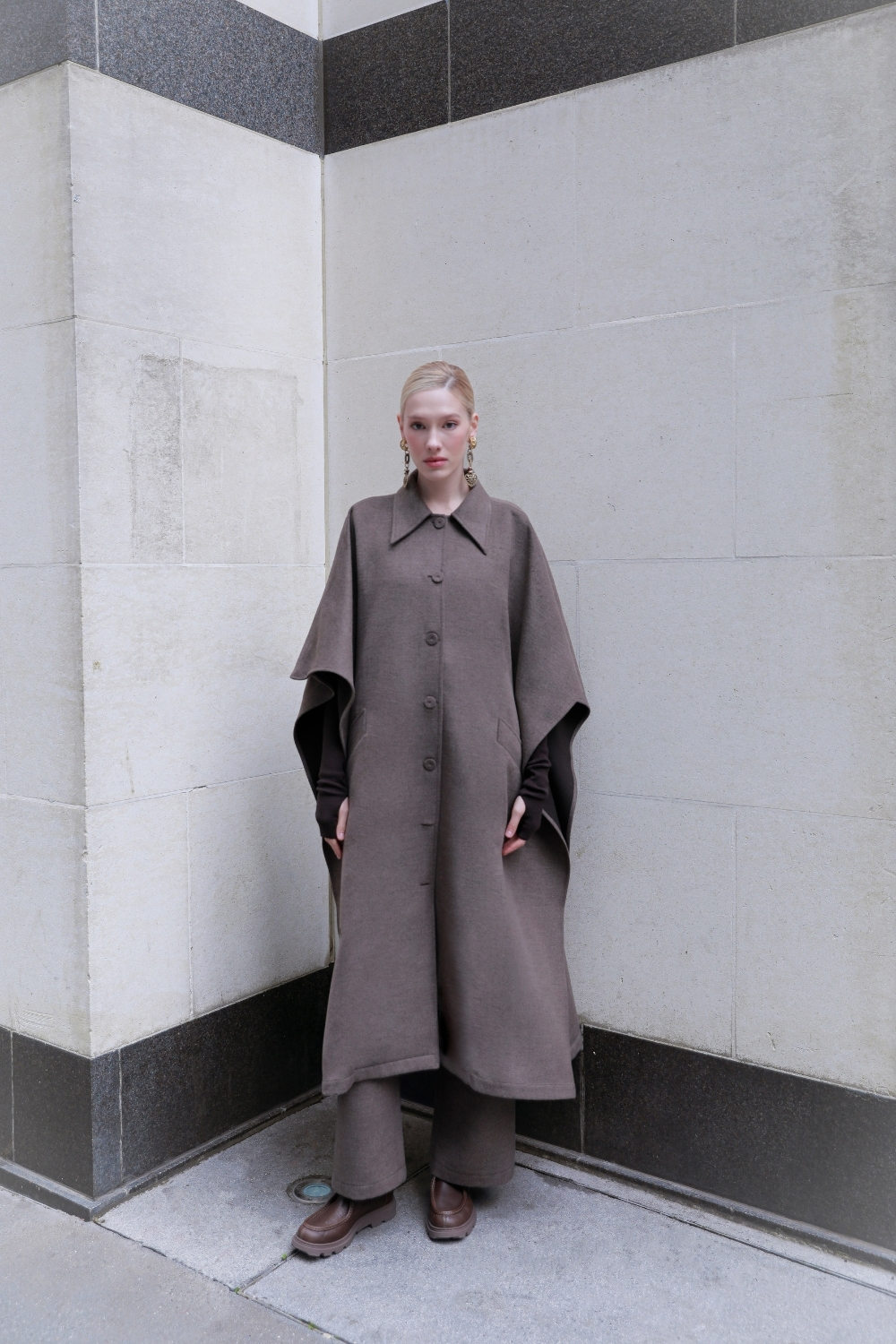 Bu şık pelerin görünümlü kaban, kumaşın iç rengi olan acı kahve detaylarıyla göz alıcı bir tasarıma sahiptir. Gömlek yakasını anımsatan maskulen yaka ve kesimi, oldukça modern ve cool bir görünüm sunar. Kabanın iki yanında yer alan cepler, hem işlevsellik hem de estetik katmaktadır. Birlikte satılan şalı kullanma seçeneği, kişisel tarzınızı yansıtmanıza olanak tanırken, şaldaki kesik detay farklı bir hava katmaktadır. Bu kaban, kış aylarında hem şıklığınızı hem de konforunuzu ön planda tutacak mükemmel bir seçimdir. %61 polyester %34 viskon %4 elastan Manken Beden Ölçüleri: Boy: 179cm Göğüs: 83 cm Bel: 62 cm Basen: 91 cm Mankenin Üzerindeki Beden : One Size