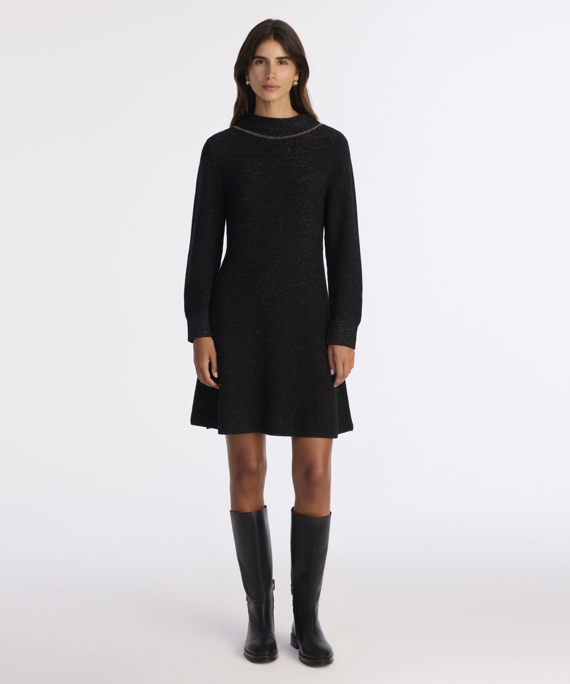 Zarif dokusu ve ince ışıltısı ile dikkat çeken bu elbise, kış sezonu için şık bir tercih sunar. Yumuşak kumaşı ve dökümlü yapısı sayesinde hem konforlu hem de elegan bir görünüm sağlar. Günlük kullanımda uzun çizmelerle, özel davetlerde ise topuklu botlarla kombinlenerek stilinizi ön plana çıkarır. Üstüne oversize bir kaban ve sade bir çanta ile tamamlanabilir.