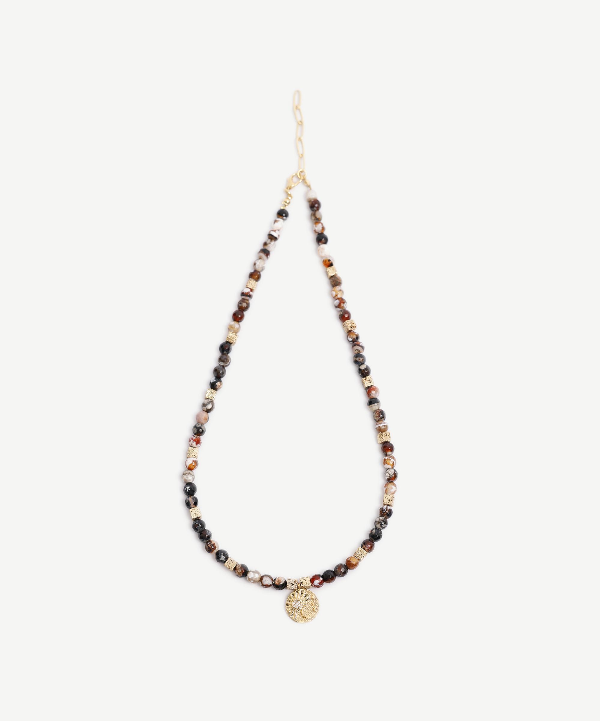 Farklı formlardaki boncuklar ve zarif madalyon detayıyla tasarlanan bu kolye, sezonun bohem esintisini stiline taşımak isteyenler için ideal bir seçenek. Gömlek yakaları ya da balıkçı yaka kazaklarla uyum içinde kullanılarak karakteristik bir görünüm yaratır. Tek başına stil sahibi bir dokunuş sunar.