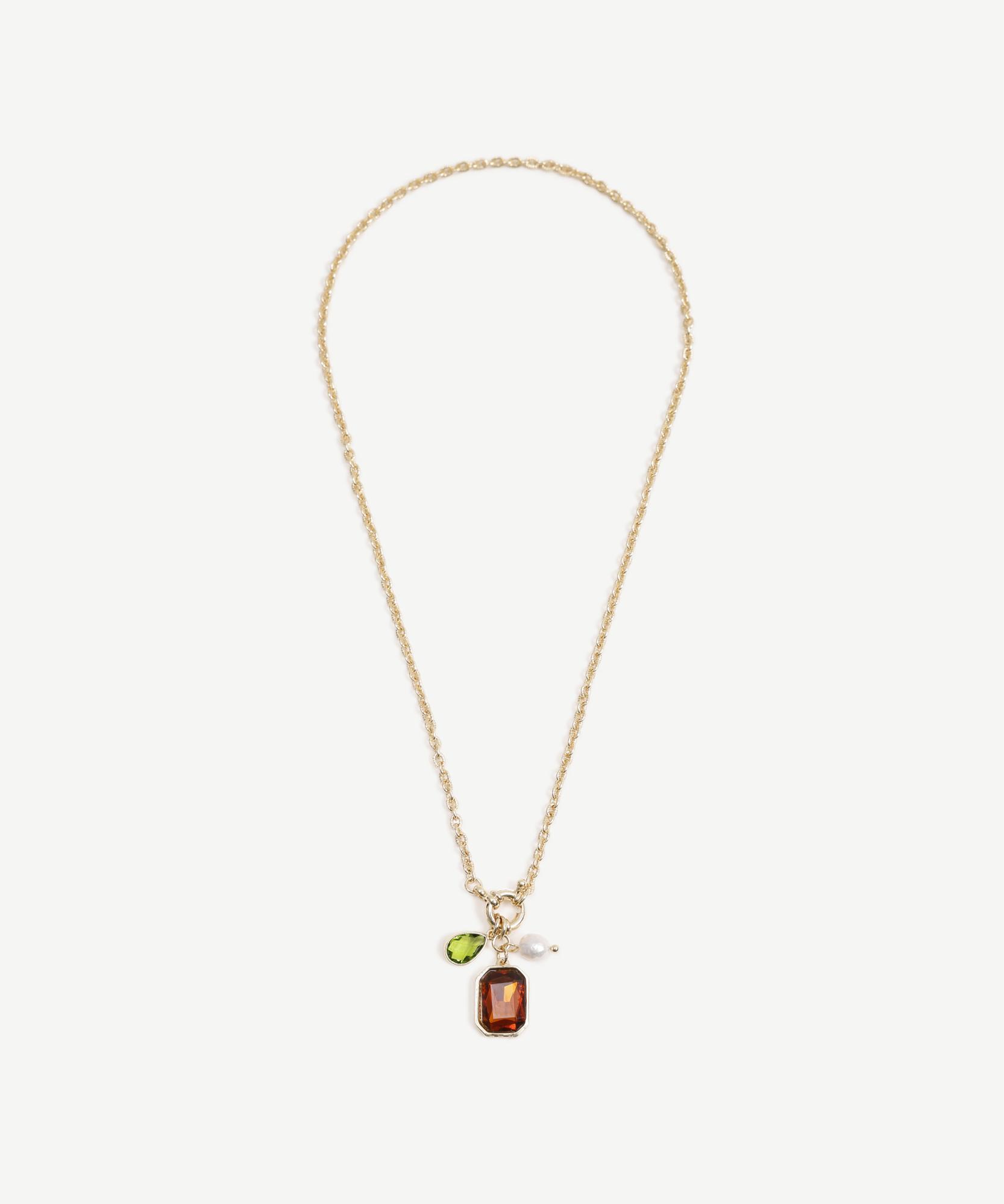 Bu kolye, taşlı detaylarıyla şık ve zarif bir görünüm sunar. Özellikle gece davetlerinde şık elbiselerle kombinleyerek göz alıcı bir stil yaratabilirsiniz.