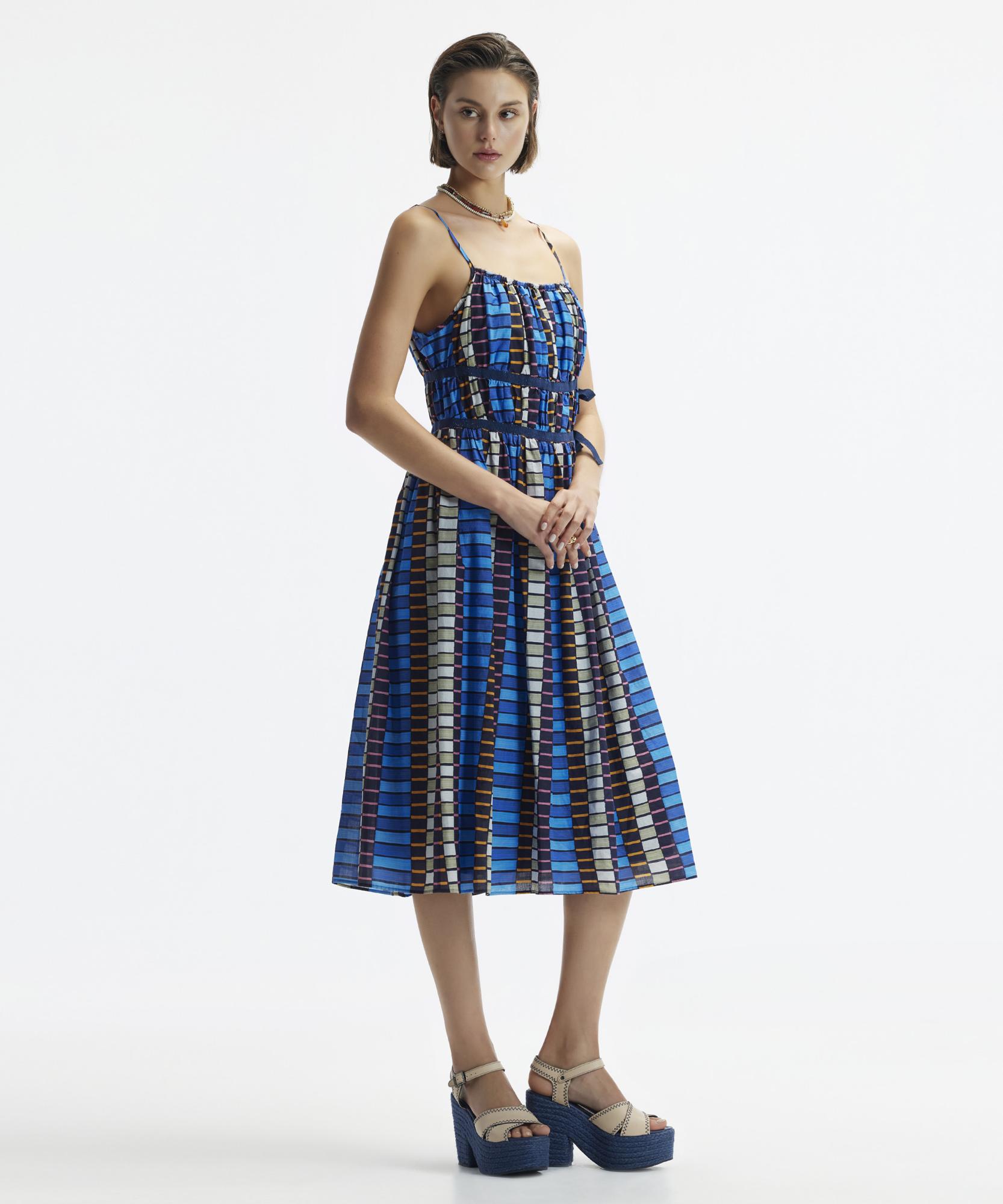 Dinamik desenleri ve modern kesimi ile bu elbise, cesur ve kendinden emin bir görünüm arayanlar için ideal bir seçenek sunuyor. Beli vurgulayan lastik detayı ile konforlu bir kullanım sağlarken kumaşın yumuşaklığı ve akıcı düşüşü, gün boyu rahat bir kullanım sunar. Bu elbiseyi düz sandaletlerle veya şık bir stiletto ile kombine edebilirsiniz.