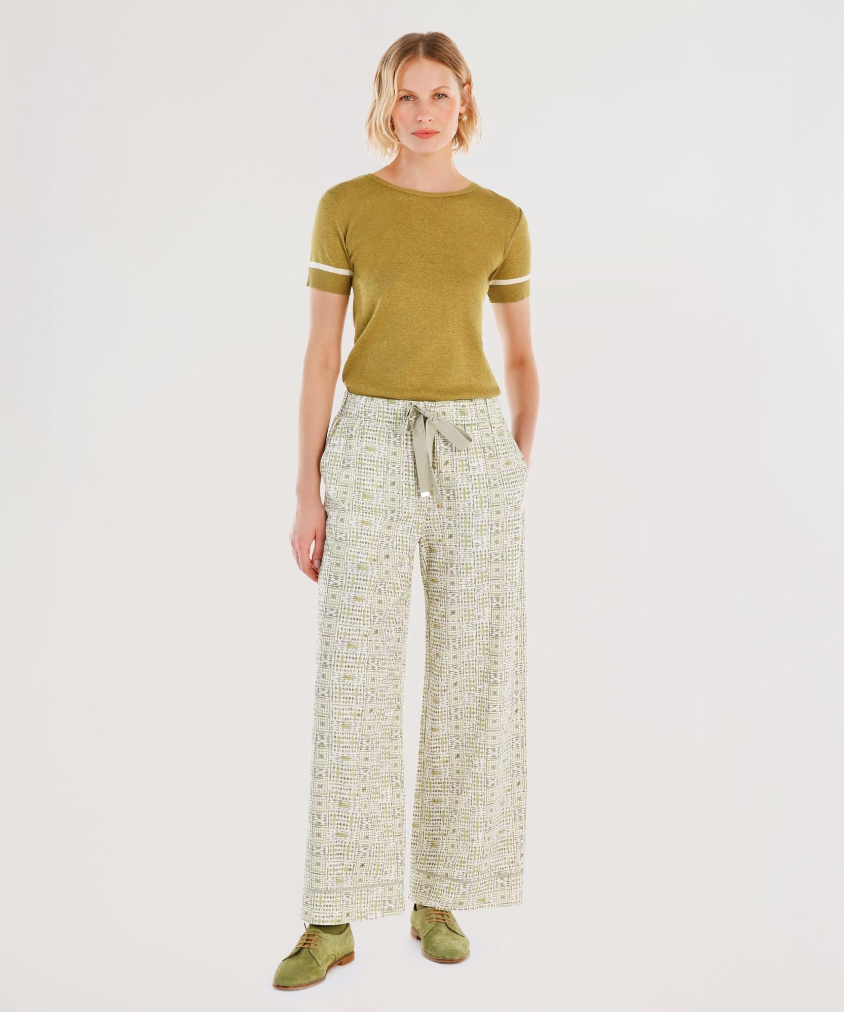 Etnik desenleriyle dikkat çeken bu bol kesim pantolon, hafif kumaşıyla konforlu bir kullanım sunar. Belindeki bağlama detayı, bohem stilin tamamlayıcısı olurken, günlük rahat kombinler için ideal bir seçenektir.
