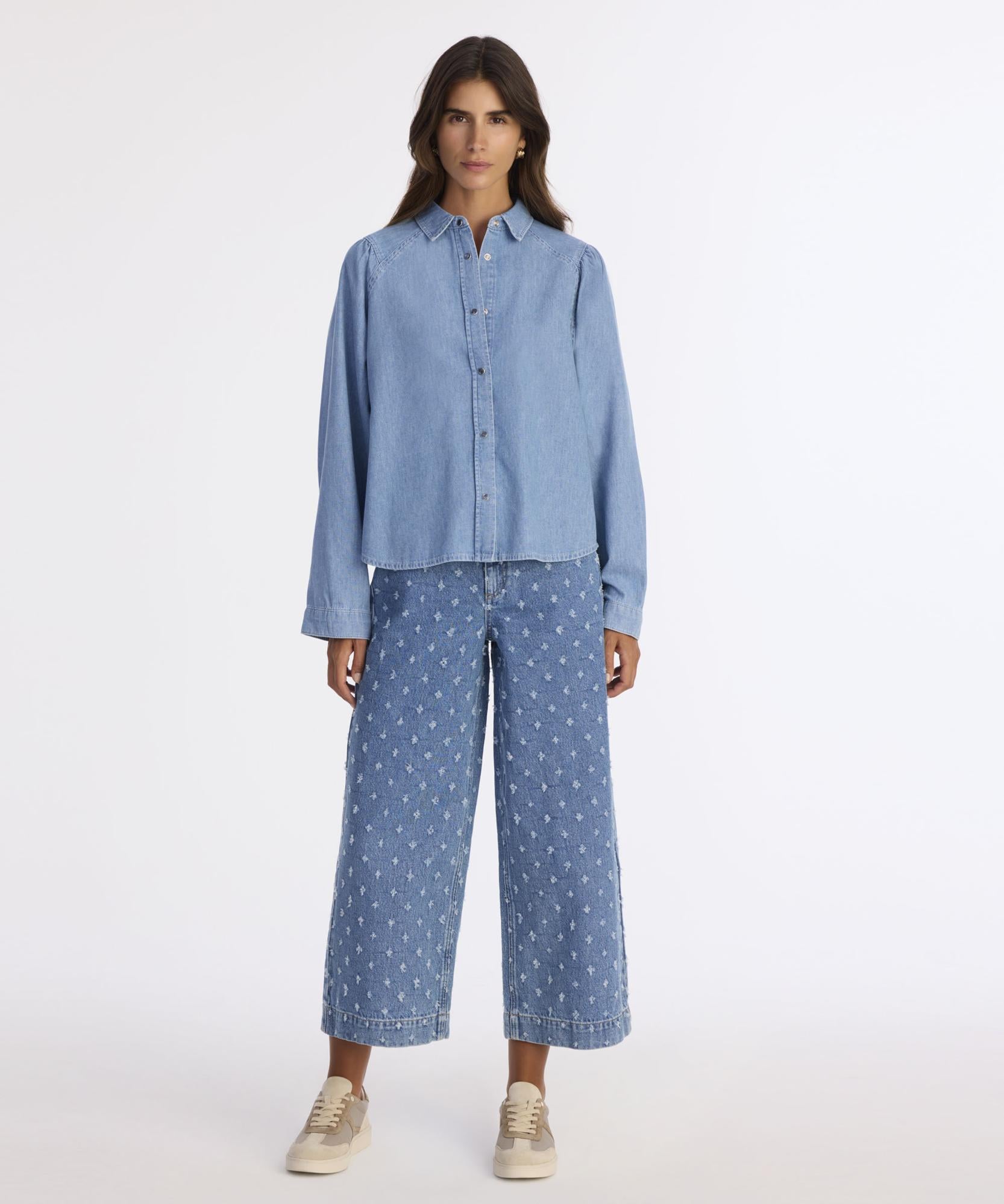 Yumuşak denim kumaşıyla konfor sunan bu gömlek, hafif balon kollu tasarımıyla feminen bir dokunuş katar. Düğme detayları ve klasik yakası ile sade ama şık bir görünüm sağlar. Kış mevsiminde balıkçı yaka trikolarla veya fitilli kazaklarla katmanlayarak modern kombinler oluşturabilirsiniz. Günlük stilinize hem rahatlık hem de tarz kazandırmak için hoş bir tercih olabilir.