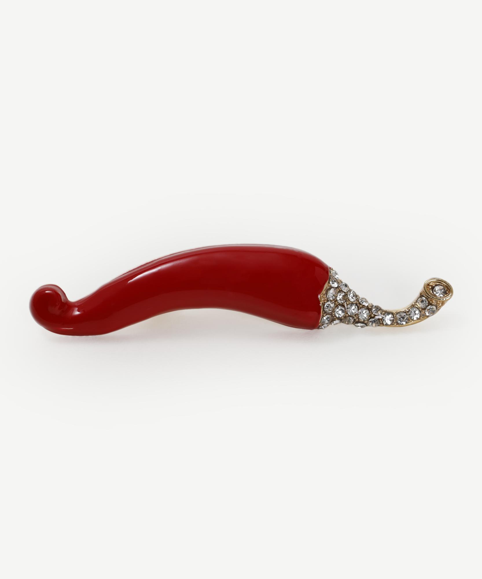 Cesur ve enerjik bir tasarıma sahip olan bu broş, ışıltılı taşlarla süslenmiş biber figürüyle dikkat çekiyor. Şans ve koruma sembolü olarak da bilinen bu aksesuar, her kıyafete karakteristik bir hava katıyor. Günlük ve şık kombinlerde farklılık yaratmak isteyenler için benzersiz bir parça.