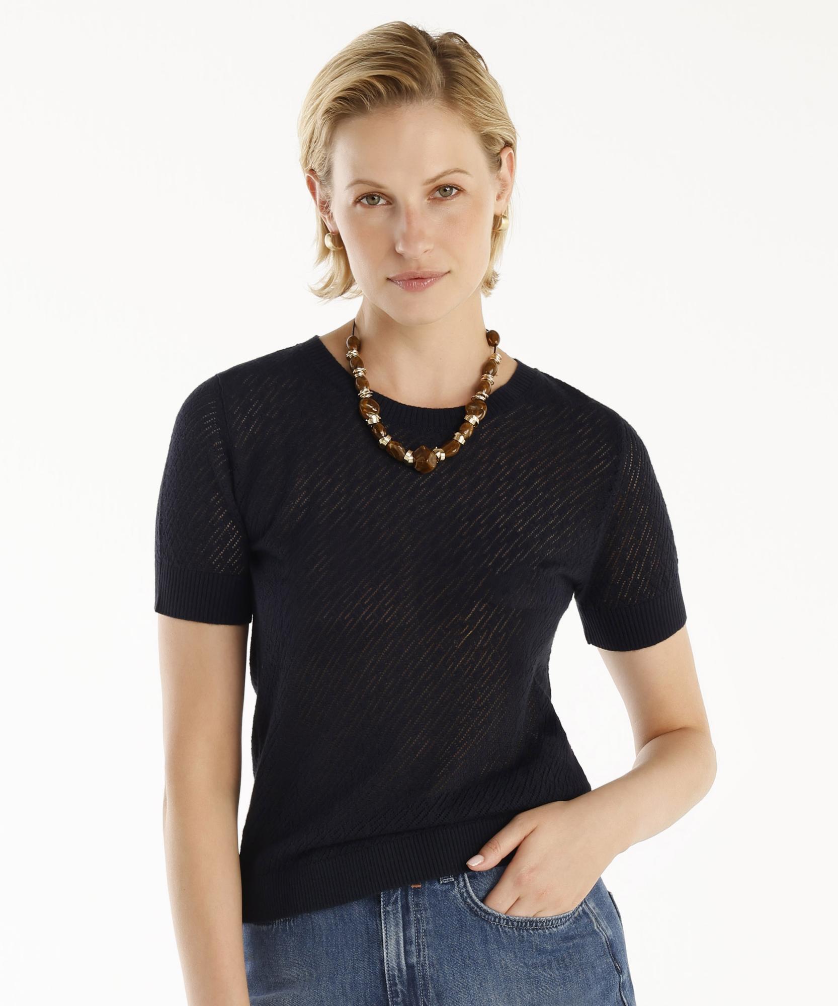 Bu kısa kollu ince örgü bluz, hafif ve şık bir seçenek sunuyor. Transparan yapısı sayesinde hem tek başına hem de katmanlı kombinlerde kullanılabilir. Pantolon ve eteklerle kombinlendiğinde, zarif ve modern bir görünüm elde edebilirsiniz.