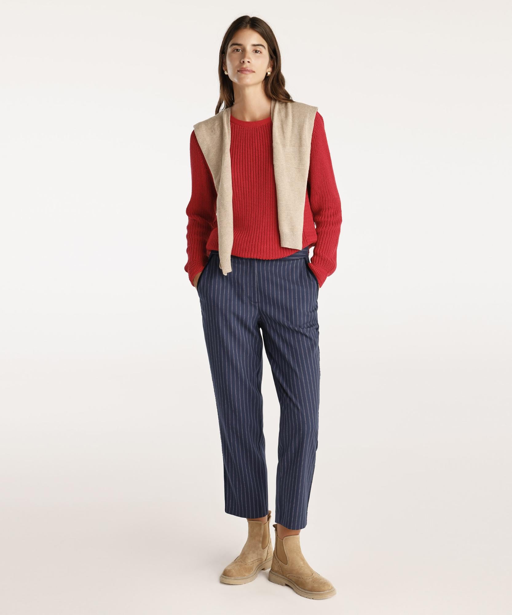 Düz kesim bu pantolon, klasik ofis tarzını modern bir dokunuşla buluşturuyor. Blazer ceket ve topuklu ayakkabılarla kombinleyerek şıklığınızı artırabilir, günlük ofis stilinizi tamamlayabilirsiniz. Ayrıca, ince triko kazaklarla da hem rahat hem de şık bir görünüm elde edebilirsiniz.