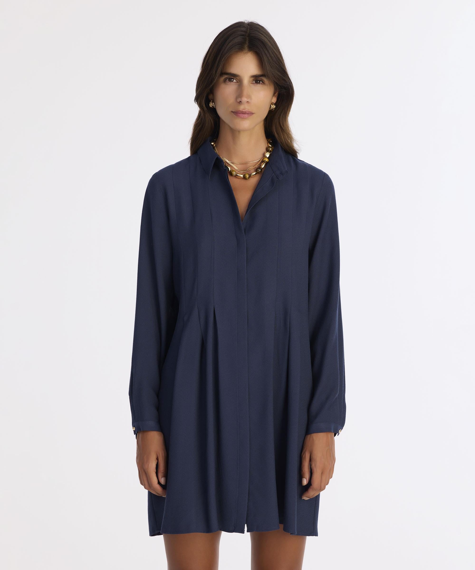 Dikine dikiş detayları ve dökümlü yapısıyla sade ama etkileyici bir duruş sunan bu elbise, rahat kalıbıyla gün boyu konfor sağlar. Gömlek yaka detayı, klasik görünümü destekleyerek çok yönlü kullanım imkânı tanır. Kış aylarında opak çoraplar ve kalın tabanlı botlarla kolayca tamamlanabilir. Saç bandı ve küçük çanta ile şıklığınız nazikçe vurgulanabilir.