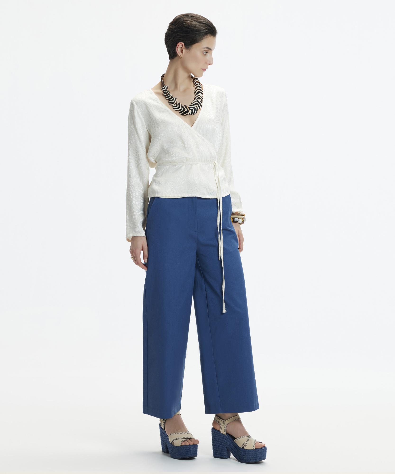 Bu geniş paça pantolon, tarzınızda rahatlığı ve şıklığı bir arada sunuyor. Bel tasarımı ile modern bir silüet oluşturan bu pantolon ile, zarif bir bluz ve topuklu ayakkabılarla mükemmel bir iş kıyafeti oluşturabilir.