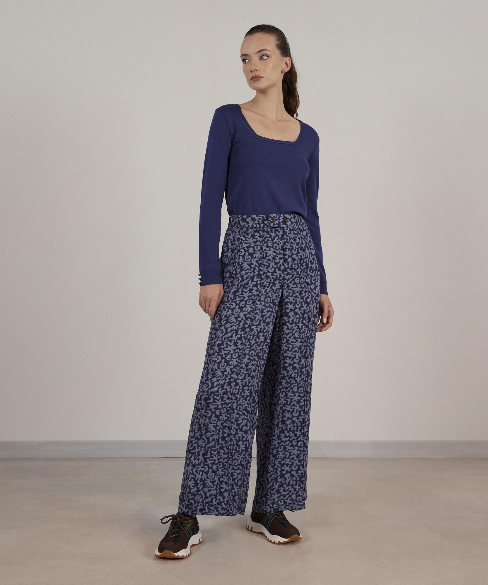 Viskon pantolon dökümlü ve nefes alabilen yapısıyla rahat tarzınızı vurguluyor. Belindeki metal düğme detayı ile dikkat çeken tasarımı klasik kombinlerinize hareket katmak için kullanabilirsiniz.