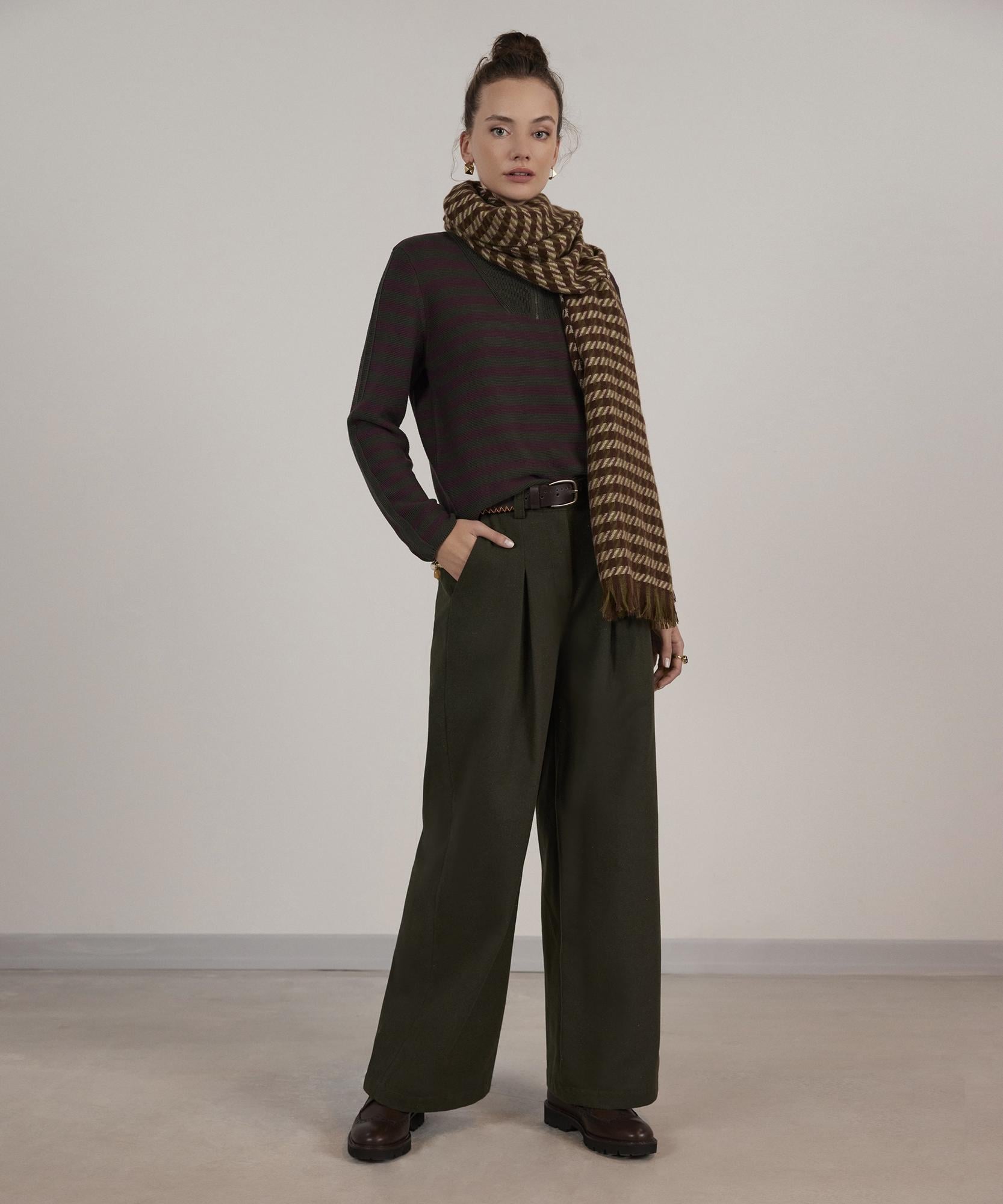 Pantolonun ön tarafındaki gizli pile detayı genel tasarımı hareketlendirerek feminen vurguyu artırıyor. Modeli triko bluzlarla eşleştirerek stilinizi yansıtabilirsiniz.