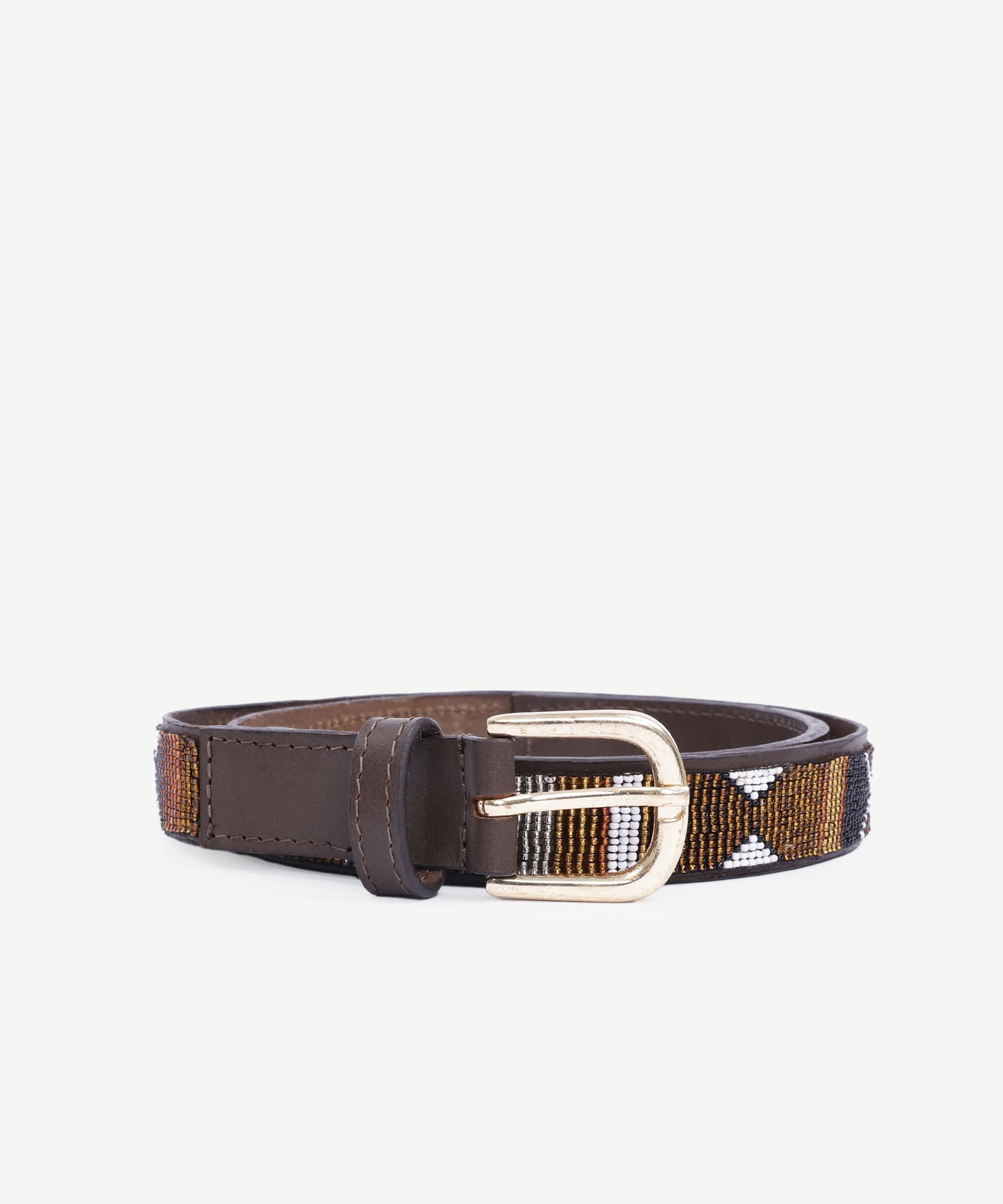 Etnik desenli boncuk işlemeleriyle öne çıkan bu kemer, sade kıyafetlere şık bir detay katmak isteyenler için hoş bir seçenek oluyor. Metal tokasıyla zarif bir duruş sunarken, günlük kombinlere özgünlük kazandırıyor. Jean pantolonlar veya düz elbiselerle kolayca tamamlanabiliyor.