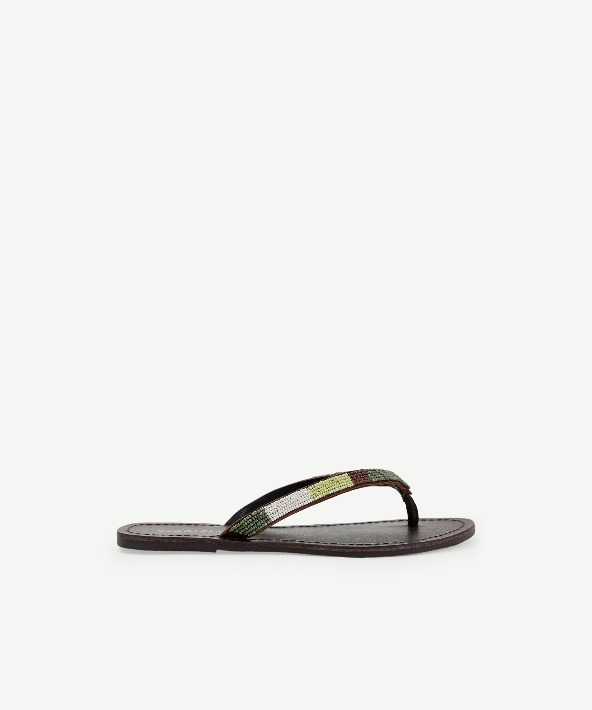 El yapımı boncuk detayları ile süslenmiş zarif parmak arası terlik, şık ve rahat bir yaz alternatifi sunuyor. Plajdan şehir gezilerine kadar farklı ortamlarda kullanıma uygun olan bu model, şortlar, hafif elbiseler ve salaş pantolonlarla mükemmel uyum sağlar.