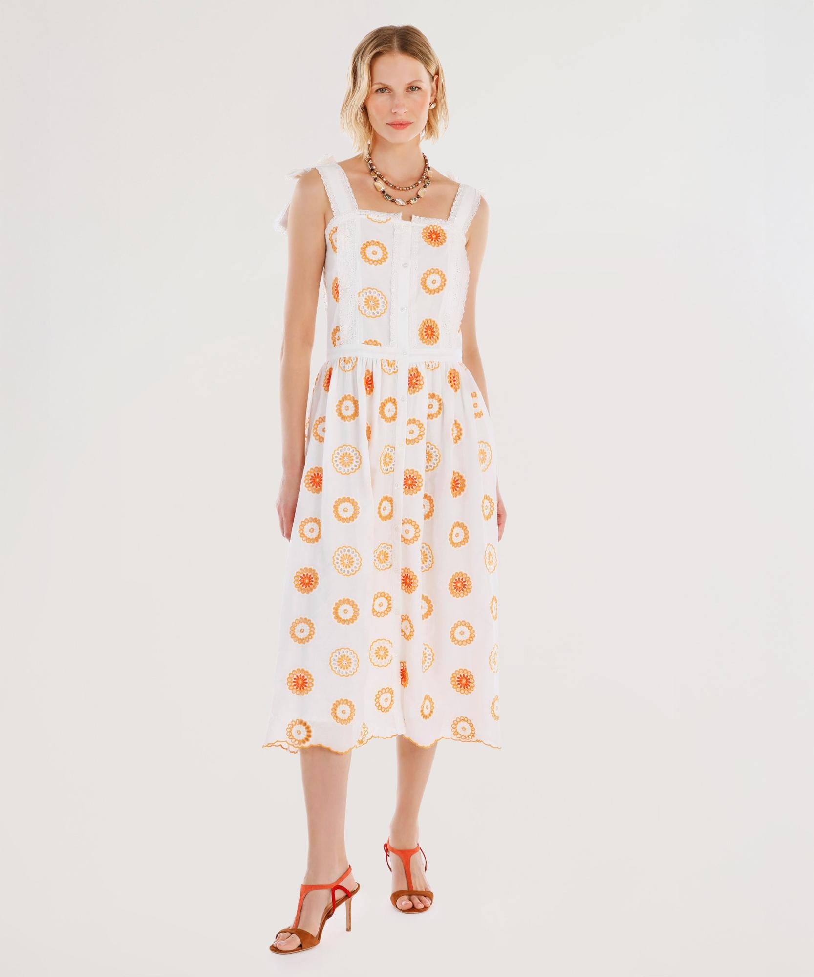 Nakış detayları ve düğmeli tasarımıyla dikkat çeken bu elbise, zarif bir nostaljik hava taşır. Hafif kumaşı sayesinde yaz aylarında serin tutar. Sandalet veya espadrillerle rahatlıkla kombinlenebilir.