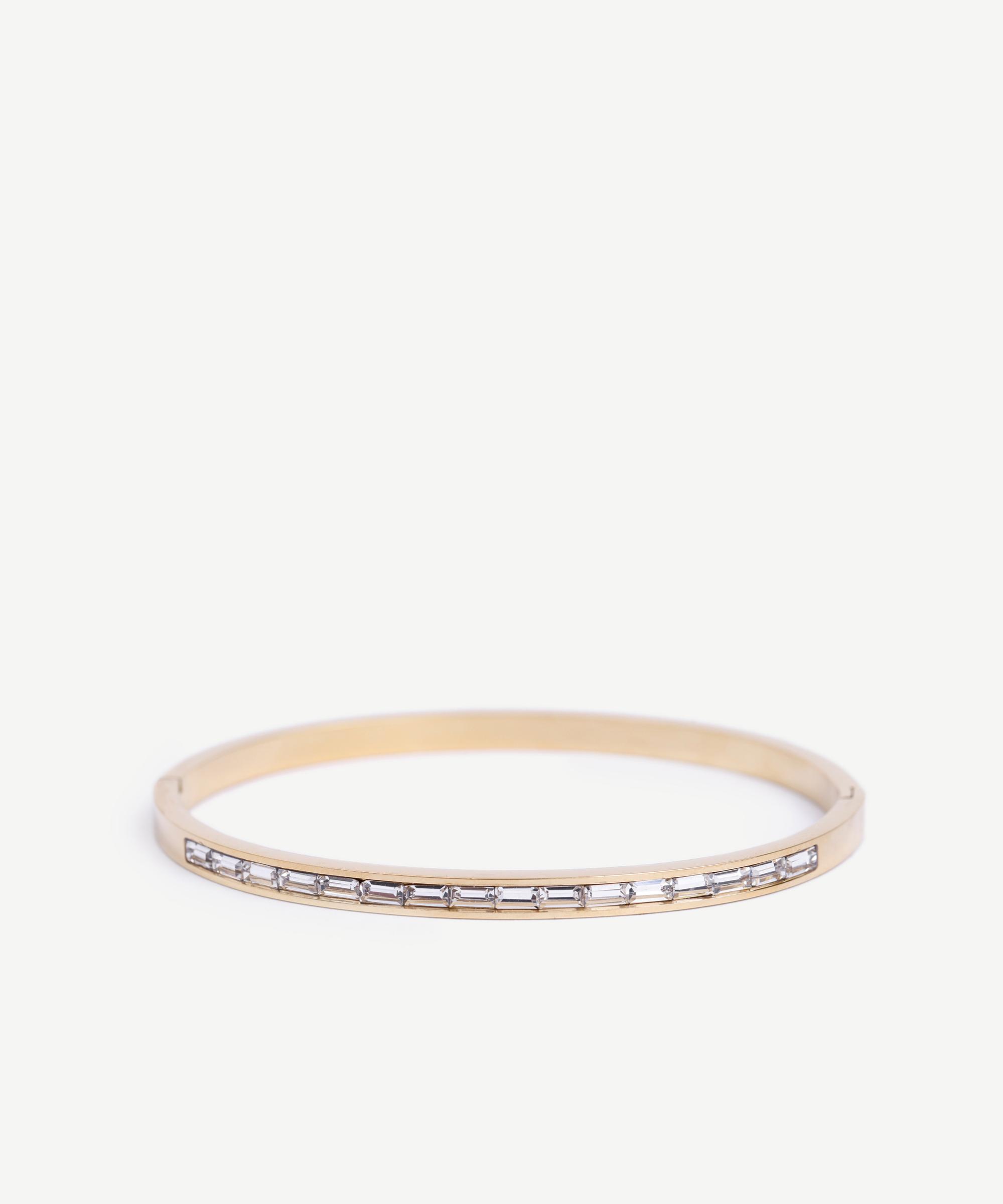Dikdörtgen taş süslemeleriyle tasarlanmış bu kelepçe bileklik, zamansız şıklığın bir yansımasıdır. Özel davetlerde ya da gece kombinlerinde zarif bir tamamlayıcı olur. İnce detaylarıyla sade ama etkileyici bir duruş sunar. Tek başına bile göz alıcı bir aksesuardır.