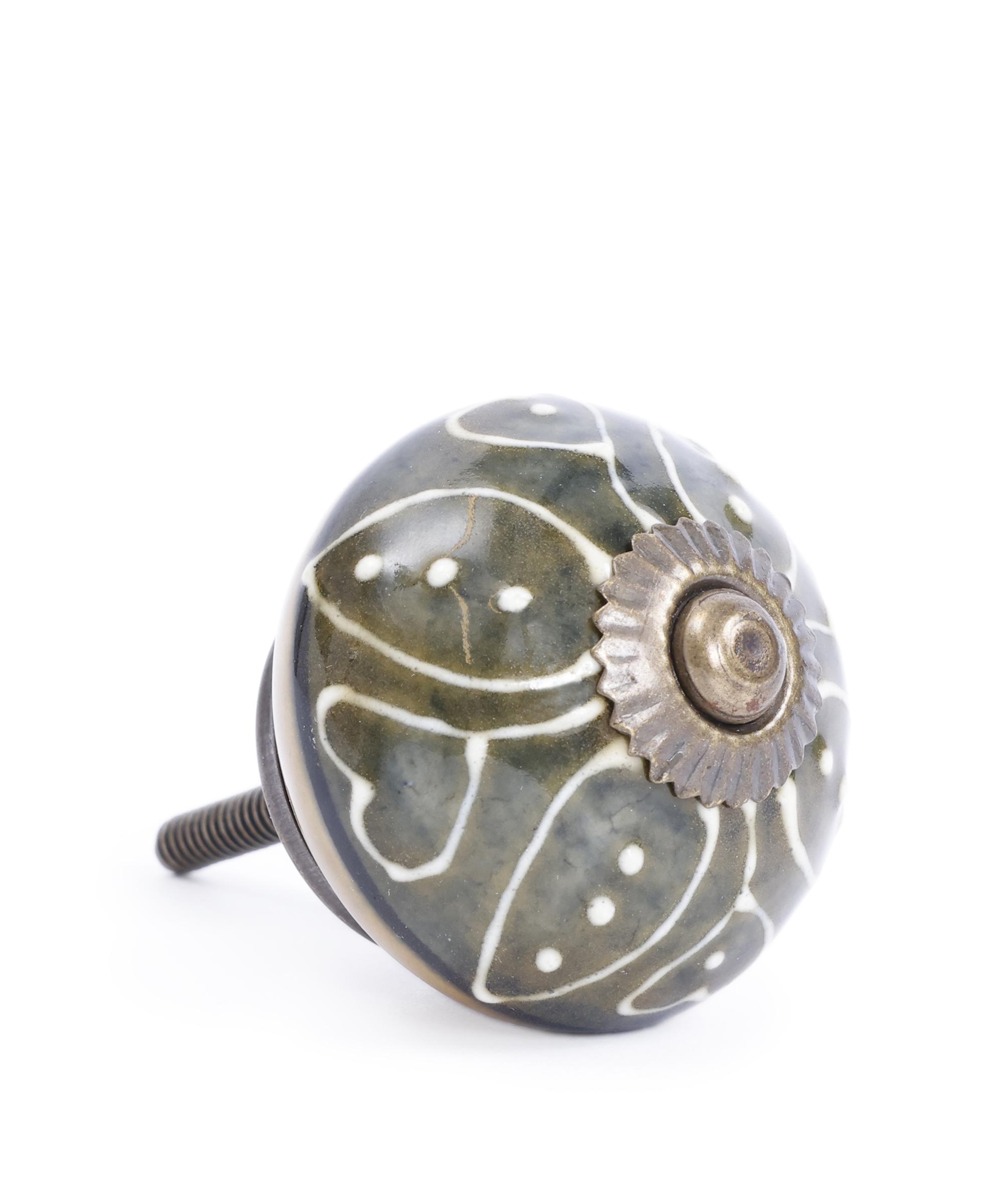 Doğal formu ve el boyaması detaylarıyla öne çıkan bu yuvarlak kulp, yaşam alanlarına sıcaklık katar. Yüzeyindeki yaprak motifleriyle doğadan ilham alır.