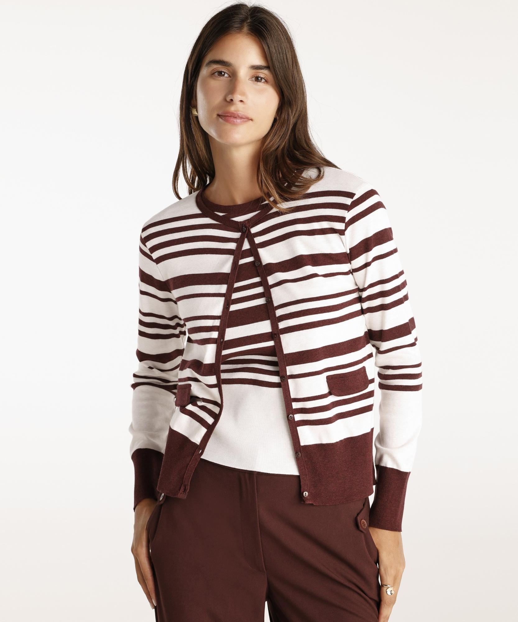 Bu çizgili hırka, hem şıklığı hem de rahatlığı bir arada sunuyor. İçine düz renk bir bluz veya t-shirt giyerek günlük kombinlerinizi tamamlayabilirsiniz. Özellikle dar kesim pantolonlar ve loafer ayakkabılarla birlikte kullanıldığında, sade ve modern bir tarz elde edebilirsiniz.