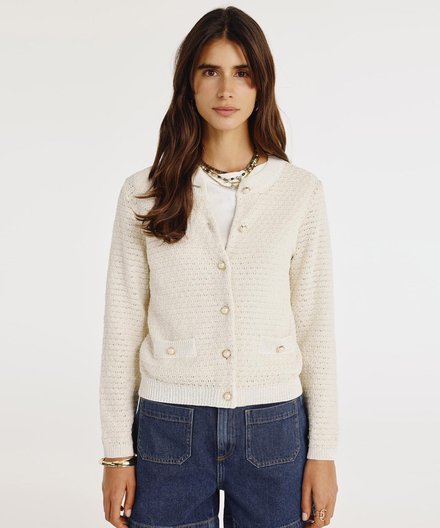 Zarif tasarımıyla dikkat çeken bu uzun kollu hırka, incili düğme detaylarıyla sofistike bir görünüm sunar. Ön kısmındaki küçük cepler, hem şıklık hem de işlevsellik katarken, rahat kesimi gün boyu konfor sağlar. Günlük kombinlerde jeanlerle veya klasik pantolonlarla kolayca tamamlanabilir.