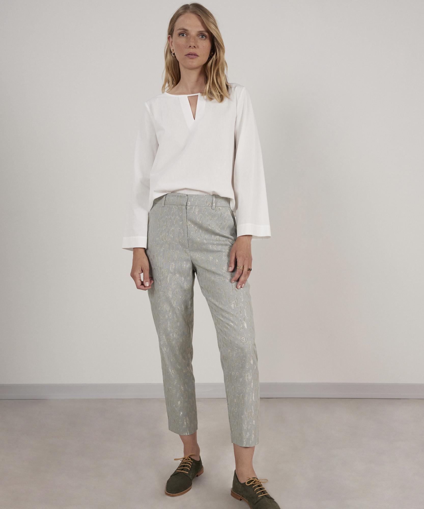 Jakarlı viskon karışımlı pantolon çabasız şıklık sağlayan tarzıyla dikkat çekiyor. Dokusu ve ışıltısı ile dikkat çeken bu tasarımı ton sür ton triko bluzlarla eşleştirebilirsiniz.