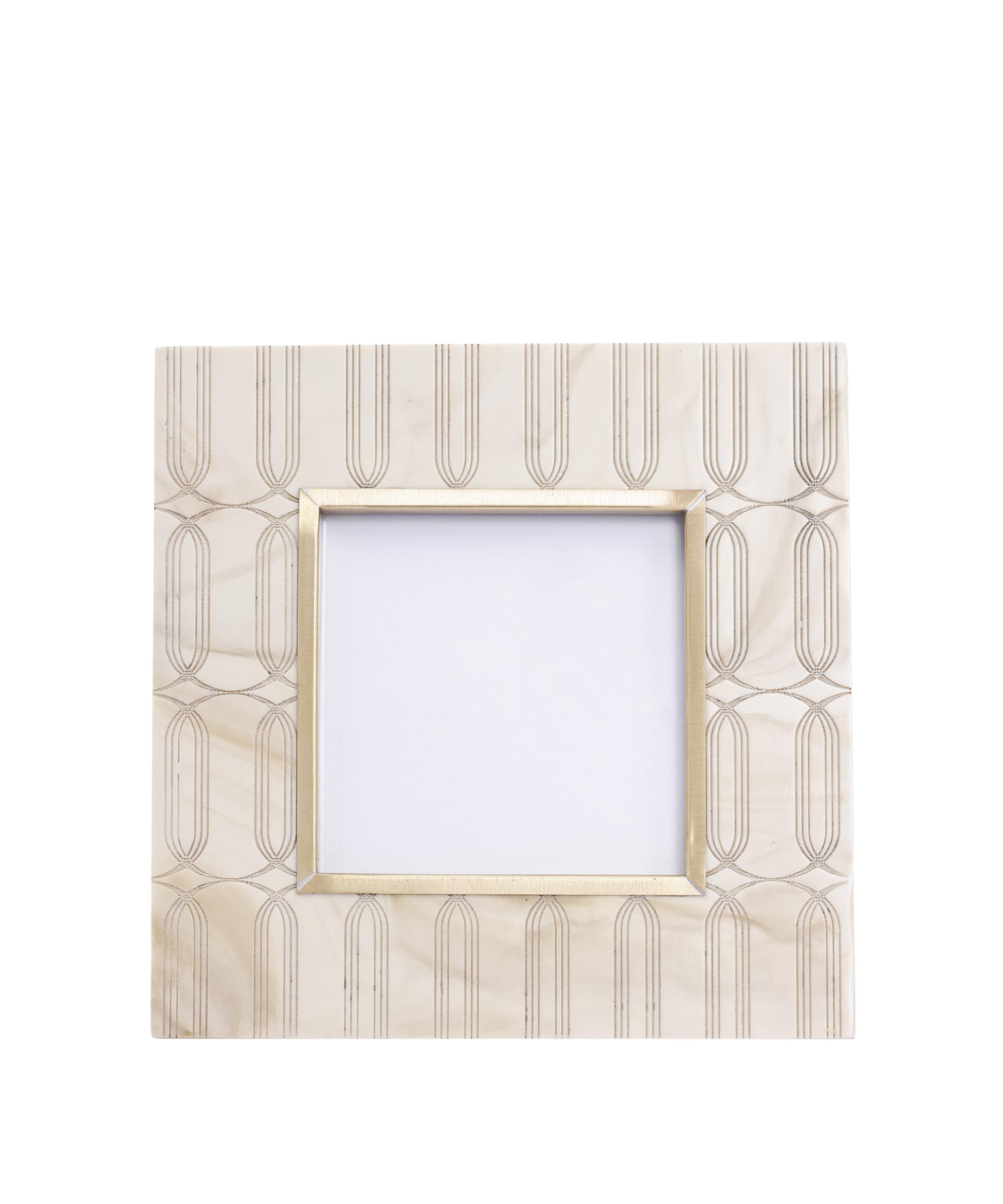 Geometrik desenlerle zenginleştirilen bu kare çerçeve, hem klasik hem çağdaş alanlara kolayca uyum sağlar. Şömine üzeri veya kitaplık raflarında şık bir tamamlayıcı olur.