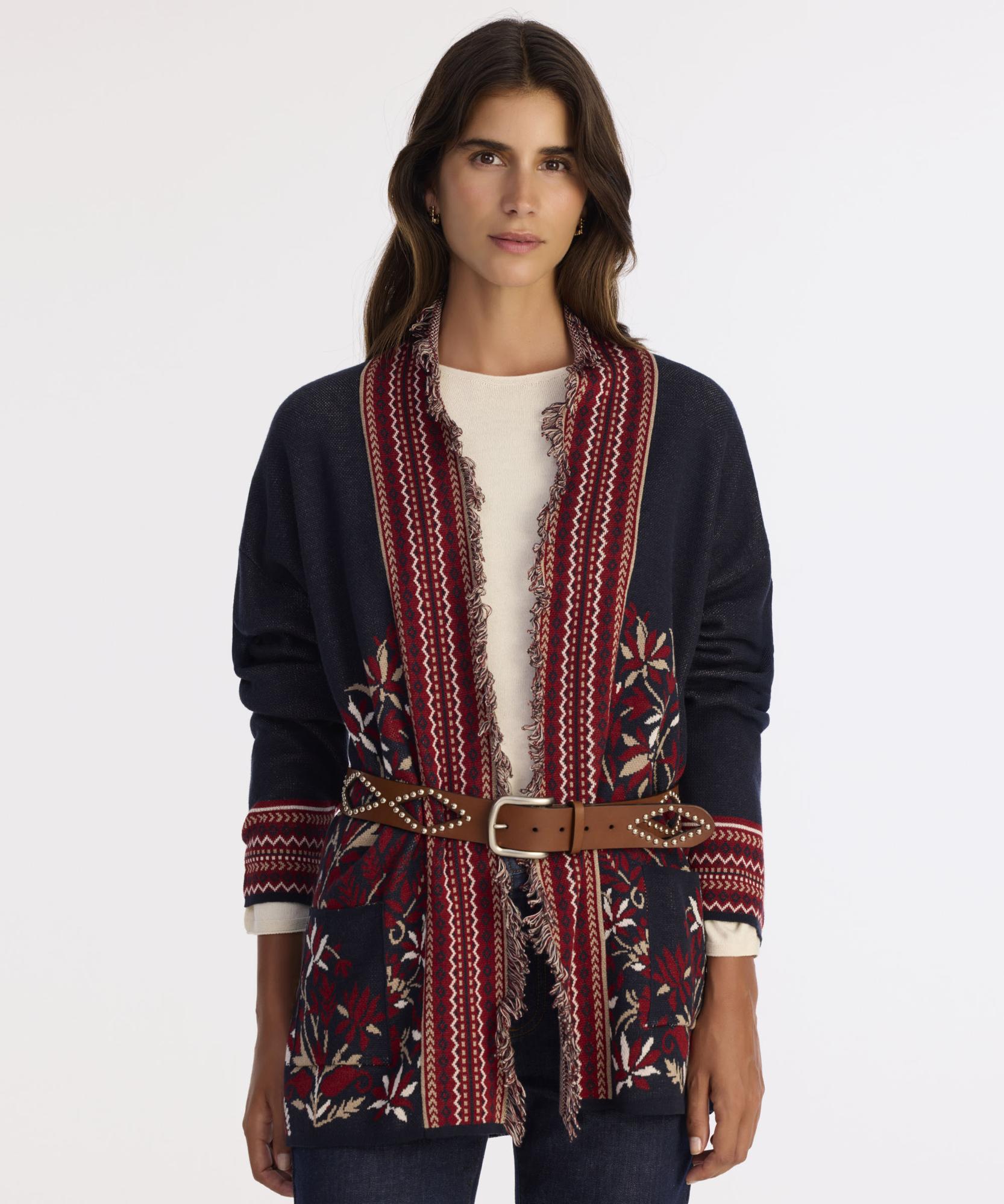 Etnik desenleri ve püskül detaylarıyla dikkat çeken bu uzun triko hırka, kış stilinize bohem bir dokunuş kazandırır. Yumuşak dokusuyla konfor sağlarken, desenleriyle zarif bir şıklık sunar. İçine basic bir kazak ve altına tayt ya da düz paça pantolonla rahatlıkla kombinlenebilir. Günlük kullanımda şık görünmek isteyenler için ideal bir tercihtir.