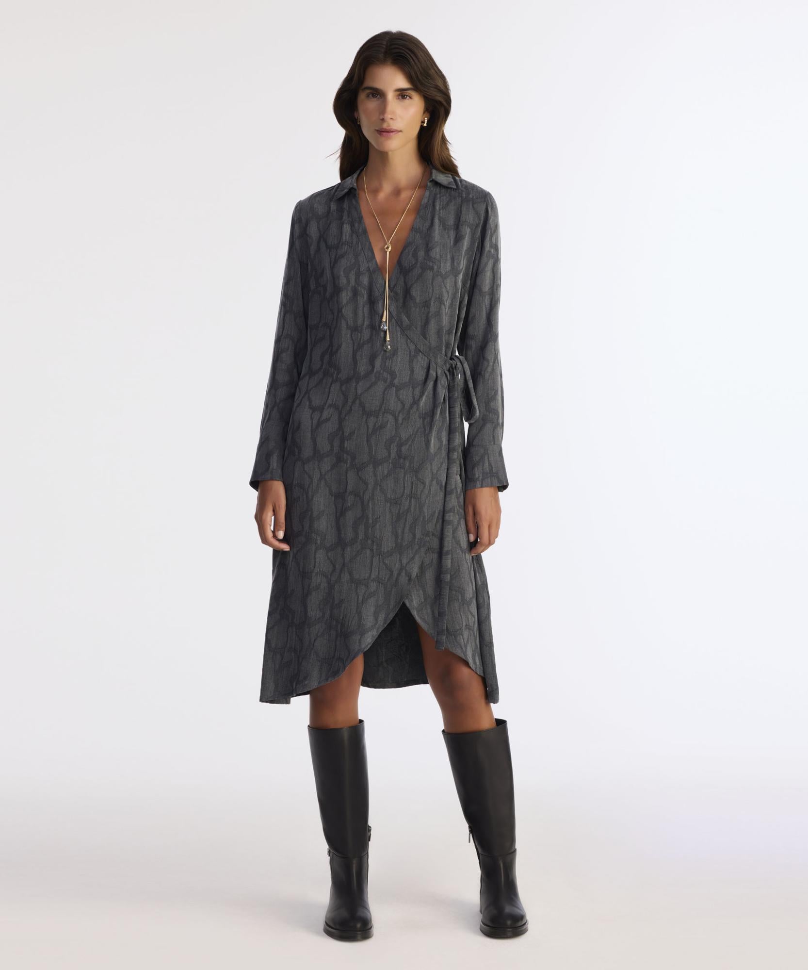 Desenli dokusu ve çapraz bağlama detayıyla öne çıkan bu elbise, feminen ve zarif bir görünüm sunuyor. V yaka kesimi ve asimetrik etek ucu, vücut hatlarını nazikçe vurgularken şıklığı da beraberinde getiriyor. Kış mevsiminde diz boyu çizmeler ve uzun bir kaşe kabanla kombinlendiğinde etkileyici bir stil oluşturur. Zarif kolyelerle görünümünüzü tamamlayabilirsiniz.