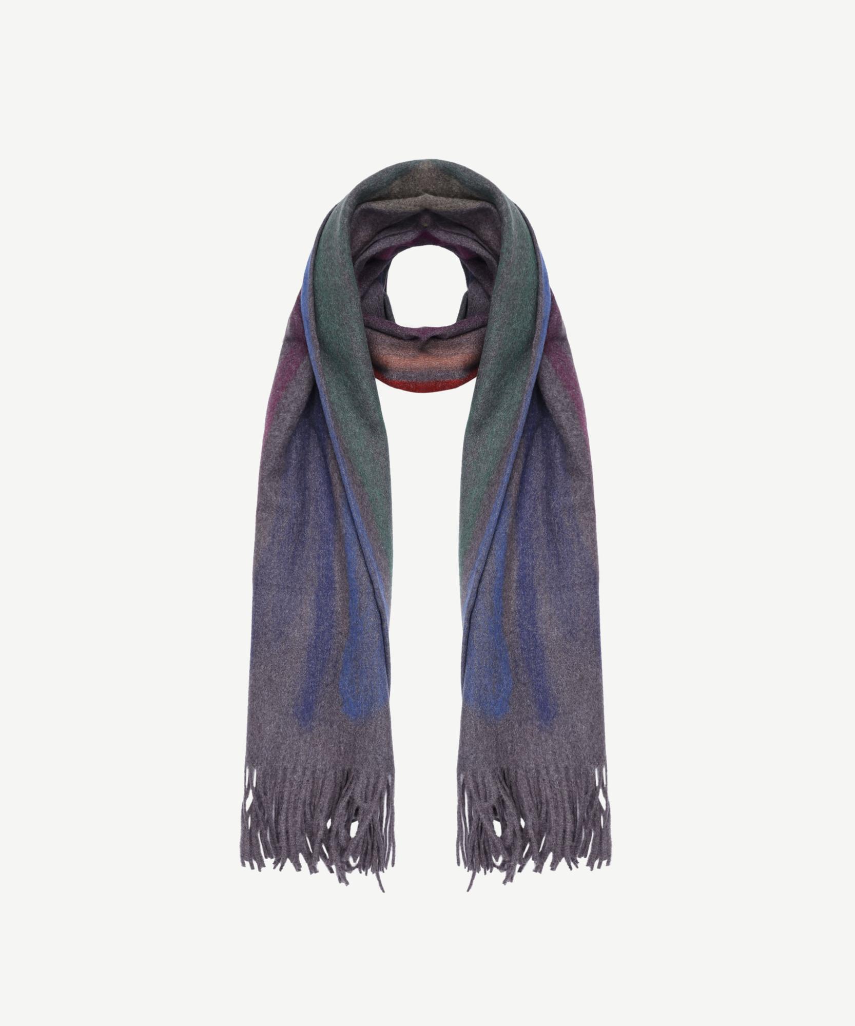 Mor, yeşil ve lacivert tonlarının yumuşak geçişlerle harmanlandığı bu şal, puslu bir kış gününün renk paletini andırıyor. Desenlerindeki akışkan formlar ve püskül detaylarıyla sade ama karakterli bir görünüm sunar. Soğuk havalarda hem sıcak kalmak hem de stil sahibi görünmek isteyenler için zamansız ve rafine bir parça.