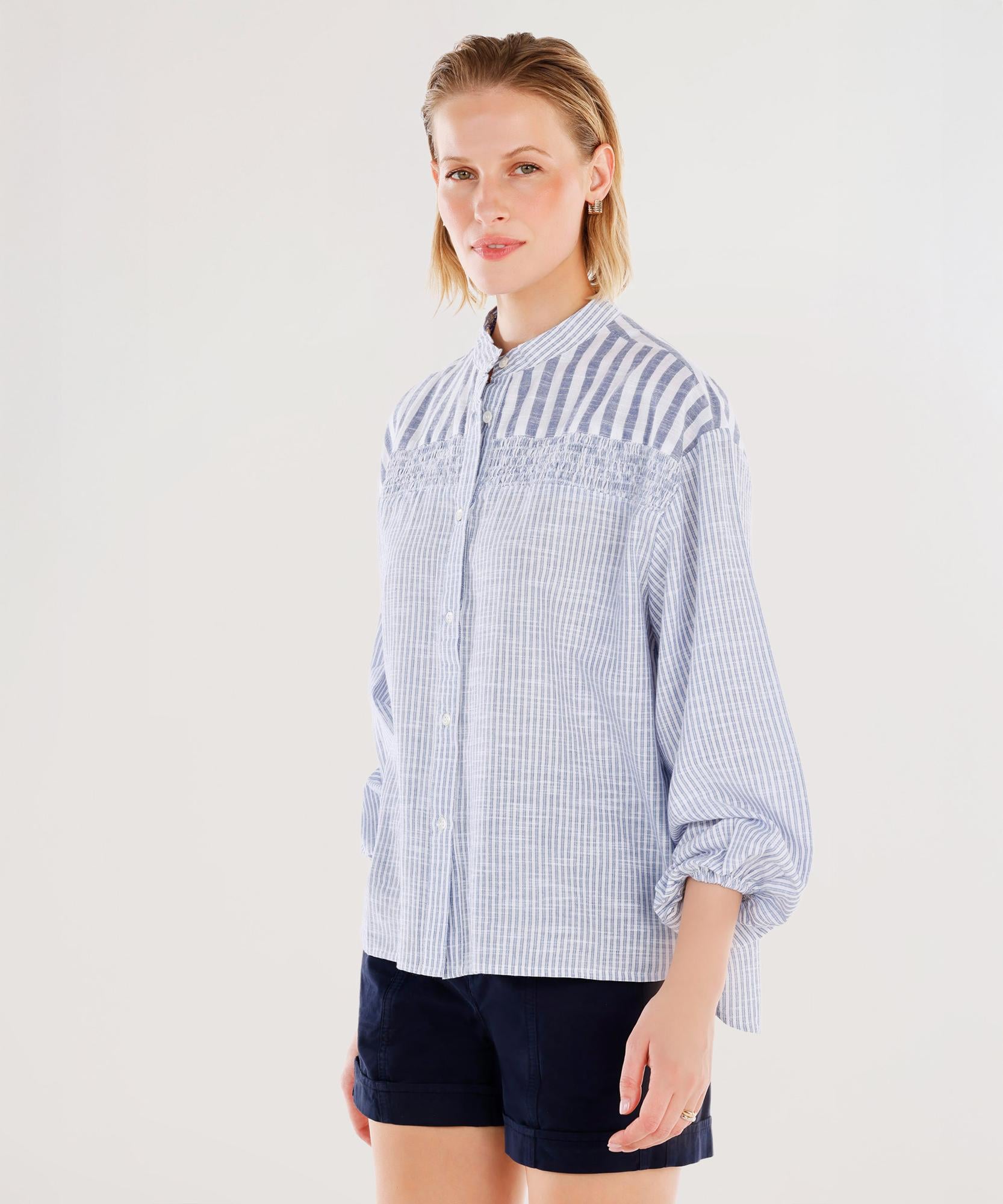 Farklı çizgi detayları ve büzgülü omuz tasarımıyla hareket kazanan bu gömlek, klasik ve modern dokunuşları bir araya getiriyor. Rahat kesimi sayesinde gün boyu konfor sunarken, yüksek bel pantolonlarla tamamlanarak şık bir görünüm elde edilebilir.