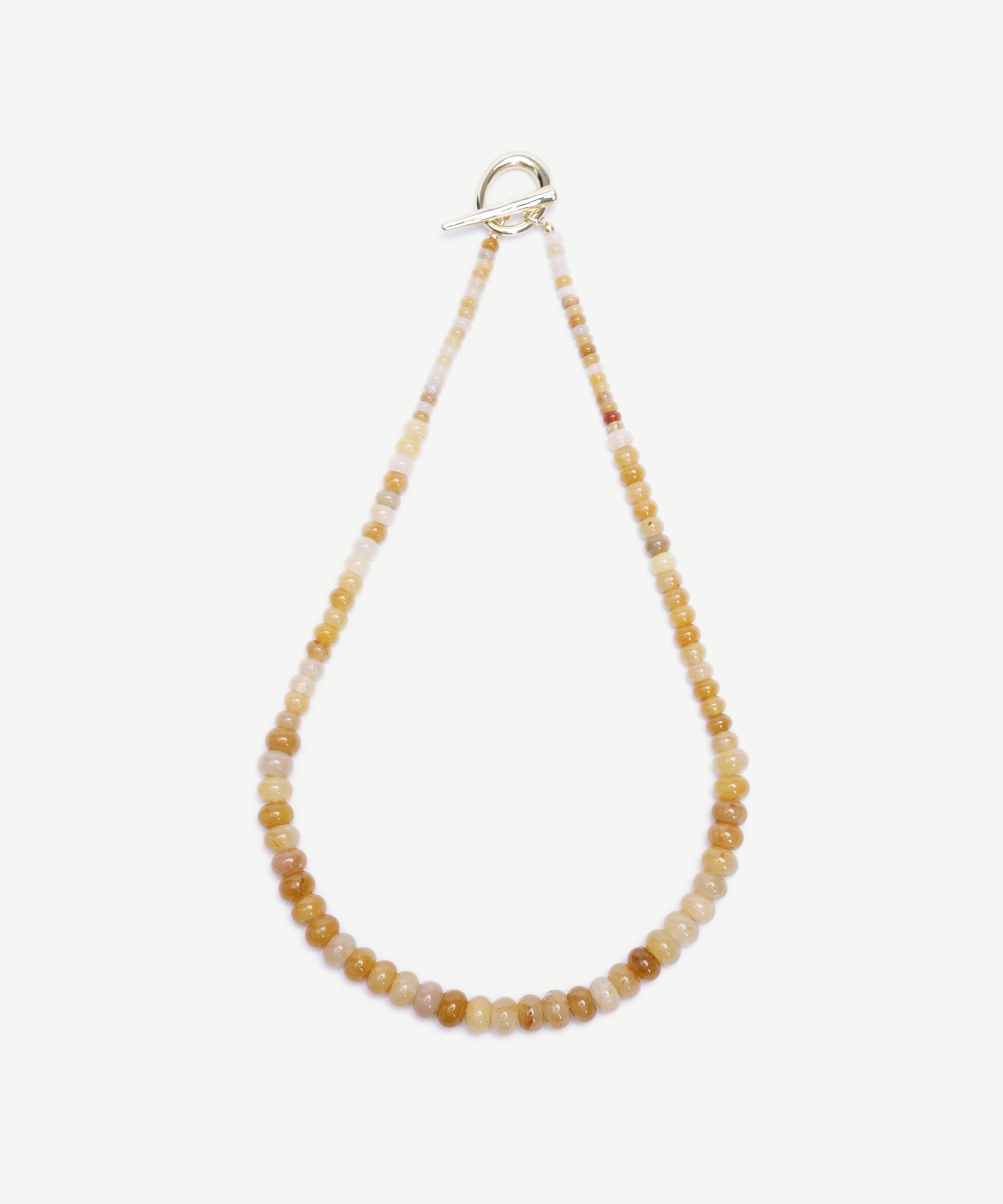 Yuvarlak kesimli taşlardan oluşan bu kolye, geçişli dizilimiyle göz alıcı bir denge sunuyor. Günlük kombinlerde doğal taşların sıcak etkisini yansıtmak isteyenler için şık bir tercih olabilir.