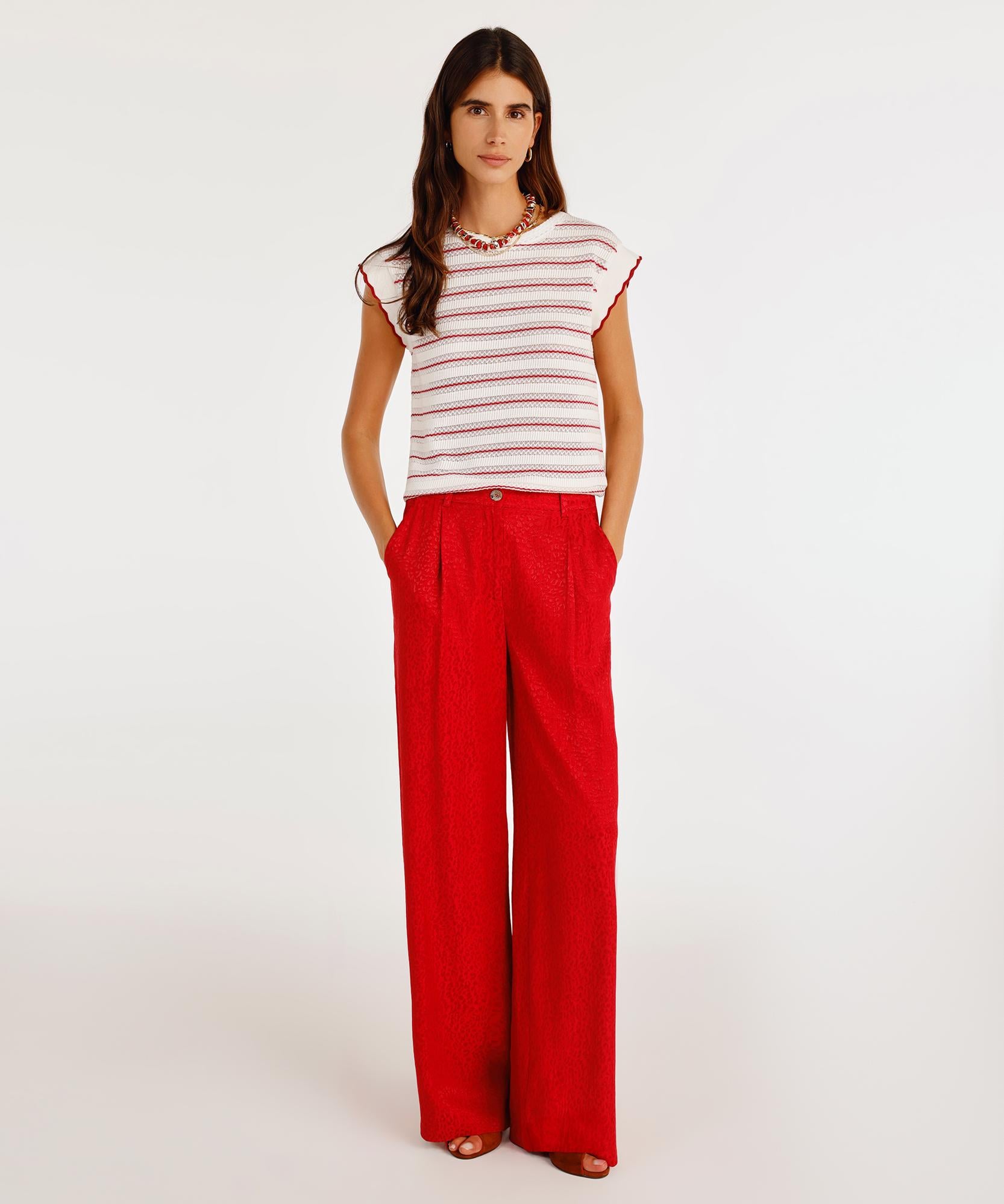 Desenli dokusuyla dikkat çeken bu pantolon, feminen ve güçlü bir duruş sergiler. Yüksek beli sayesinde vücut hatlarını dengeli gösterirken, bol paça yapısıyla hareket özgürlüğü sunar.
