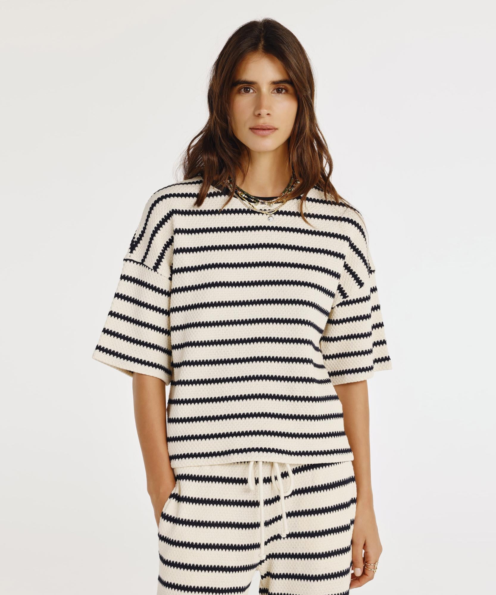 Düşük omuz kesimiyle modern ve rahat bir duruş sergileyen t-shirt, hafif kumaşıyla gün boyu konfor sağlar. Salaş kesimiyle şıklığı ve rahatlığı bir arada sunarak her kombine sofistike bir hava katar. Hem tek başına hem de katmanlı kombinlerde kolayca kullanılabilir.