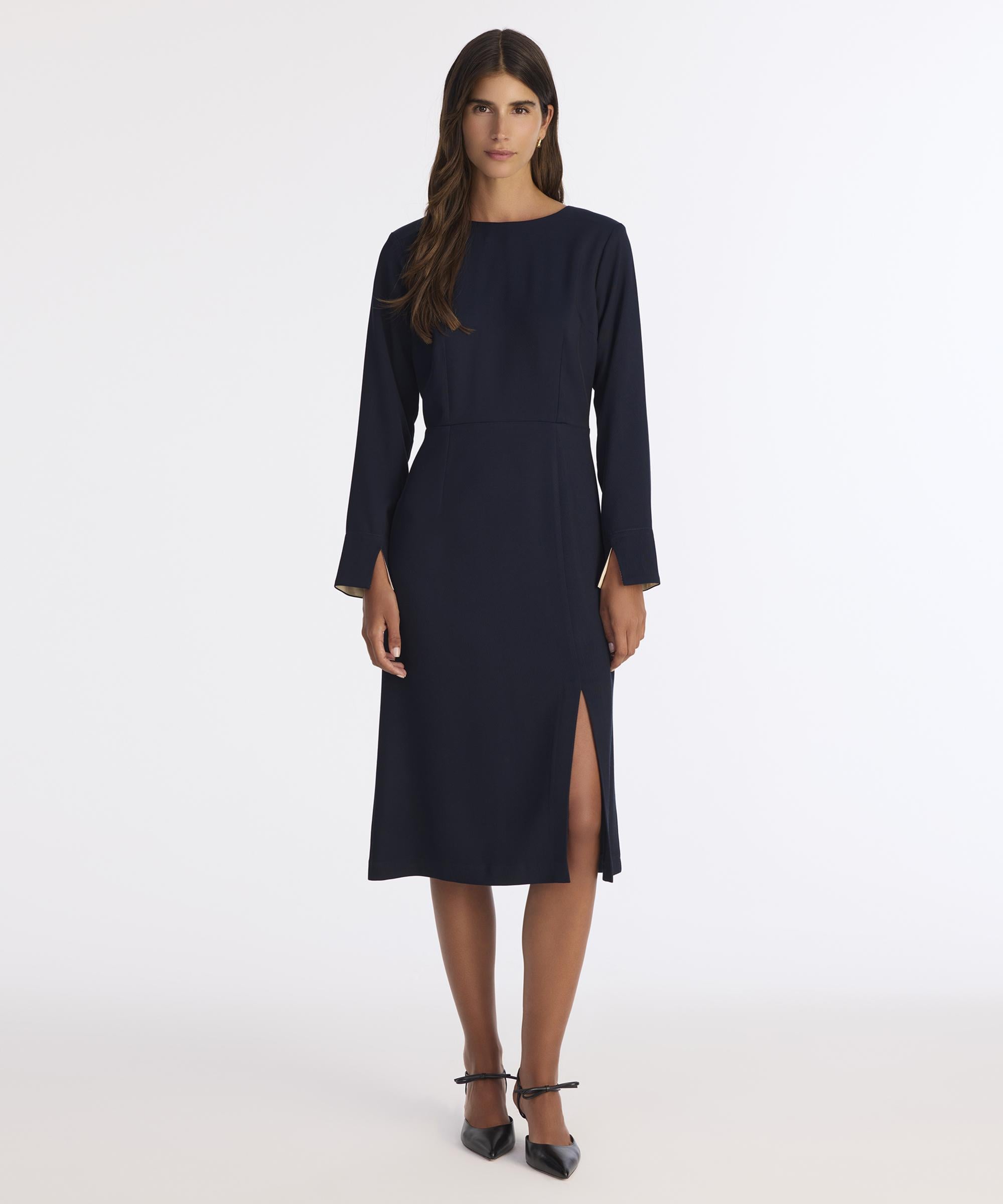 Dik yaka detayı ve zarif yırtmaç tasarımıyla öne çıkan bu elbise, şıklığı sade bir duruşla birleştiriyor. Vücudu saran yapısıyla feminen bir siluet sunarken, kış aylarında opak çorap ve uzun trençkotlarla mükemmel bir uyum yakalıyor. Gündüz ofis stilinde düz botlarla, akşam ise topuklu çizmelerle kolayca tamamlanabiliyor. Sade takılarla şıklığınız nazikçe ön plana çıkıyor.